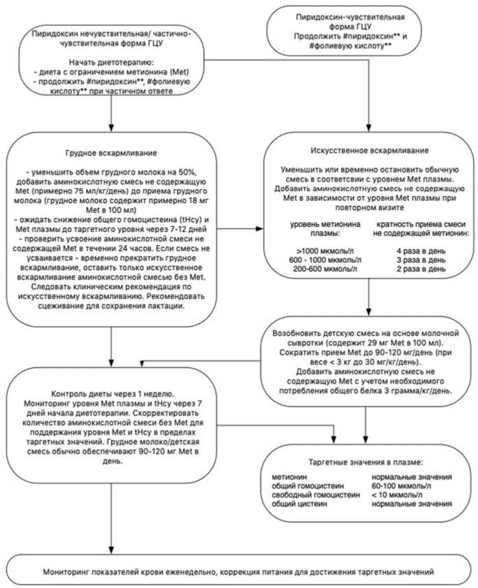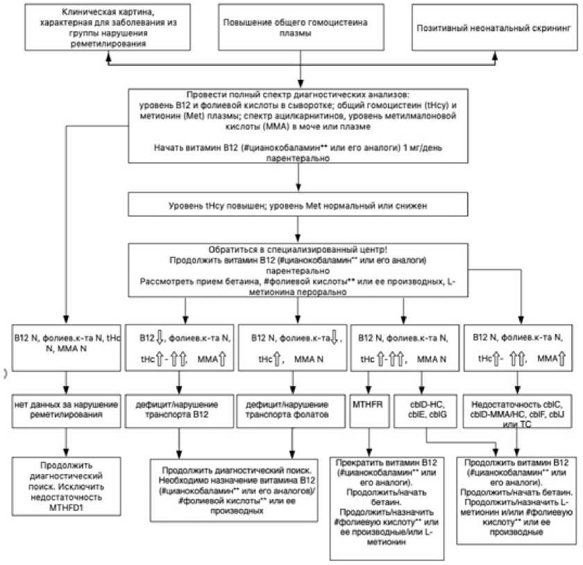 В данных клинических рекомендациях рассматривается подробно классическая гомоцистинурия, и вариант связанный с дефицитом MTHFR, а формы метилмалоновой ацидурии с гомоцистинурией, более подробно рассматриваются в клинических рекомендациях по метилмалоновой ацидурии, поскольку подходы к их терапии отличаются от ГЦУ.
