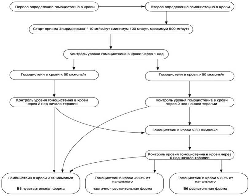 - Гомоцистинурия, обусловленная нарушением транссульфурации (классическая гомоцистинурия, подразделяющаяся на B6-чувствительную и B6-резистентную);