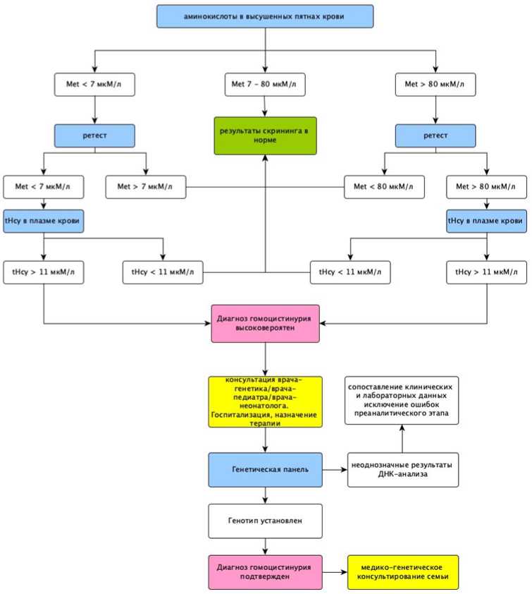 На основании клинических симптомов врач может заподозрить заболевание и далее отправить пациента на специализированное лабораторное исследование. При гомоцистинурии повышается в крови уровень свободного и общего гомоцистеина, а также уровень аминокислоты метионина. Исследование мочи на органические кислоты позволяет исключить формы гомоцистинурии с метилмалоновой ацидурией. Далее путем молекулярно-генетического анализа выявляют мутации в гене CBS. Очень важно провести этот анализ, поскольку уже по генотипу в некоторых случаях возможно определить будет ли чувствительность к терапии витамином B6 или нет.