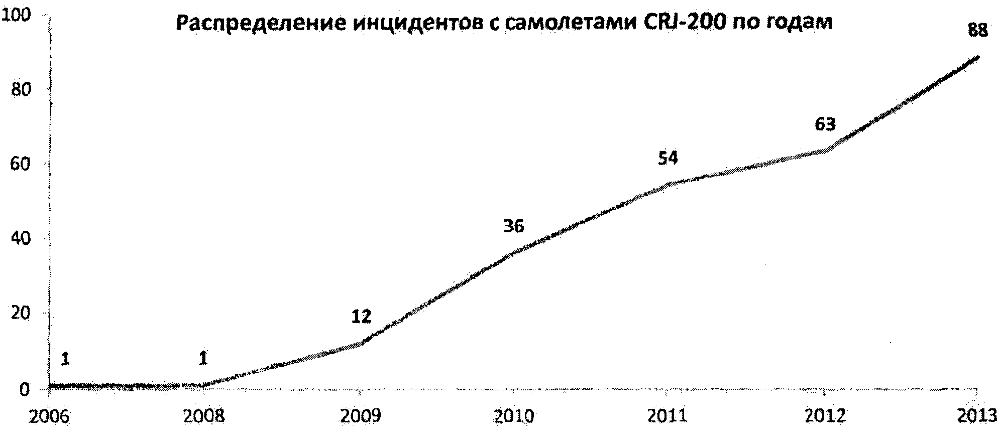 Следует отметить, что ежегодный рост инцидентов сопровождается увеличением налета на самолетах типа CRJ-200. Так в 2010 году налет на инцидент на самолете типа CRJ-200 составлял - 355 часов, в 2011 - 697 часов, в 2012 - 972 часа.