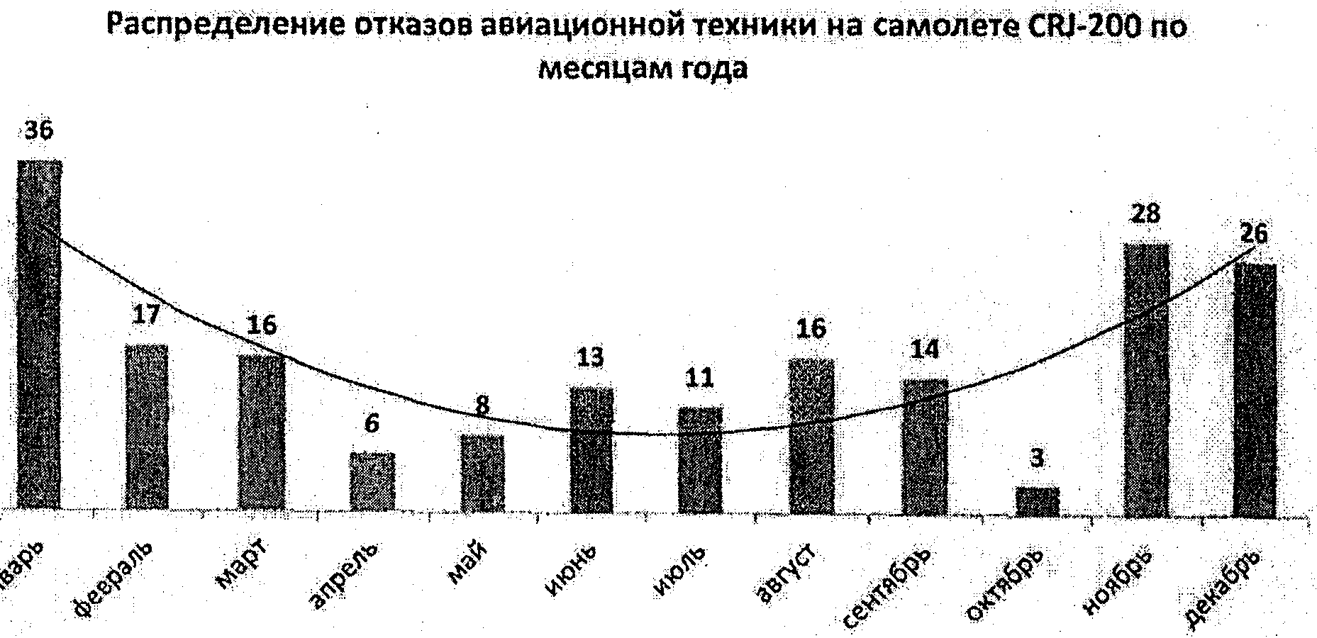 Наибольшее количество авиационных событий с самолетами типа CRJ-200 связано с отказами авиационной техники. Распределение отказов авиационной техники на самолетах типа CRJ-200 по месяцам представлено на рис. 2.