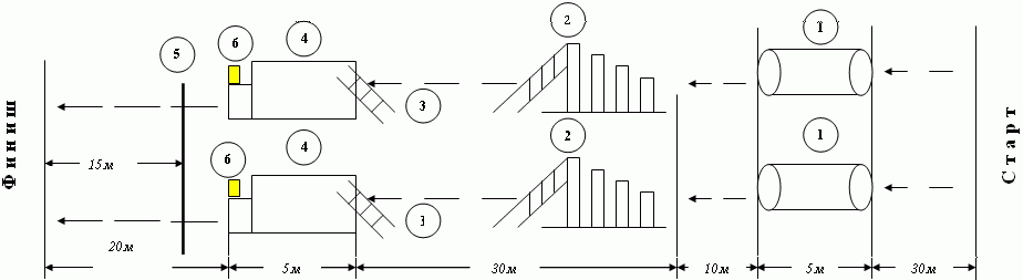 Соревнования по преодолению 100-метровой полосы препятствий (Приложение N 1) проводятся в последовательности: