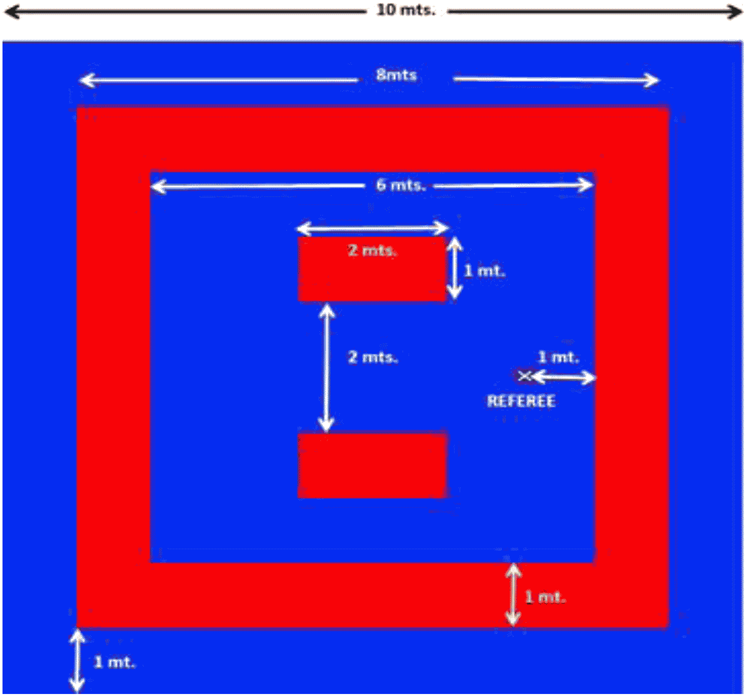 2.1.2. Площадка для соревнований представляет собой квадрат, покрытый матами, одобренного WKF типа. Длина сторон площадки 8 м (измерение по внешней стороне) с дополнением одного метра по всем сторонам в качестве зоны безопасности. Граница шириной в один метр должна быть другого цвета относительно покрытой матами площадки. Свободная зона безопасности шириной один метр должна быть с каждой стороны площадки.