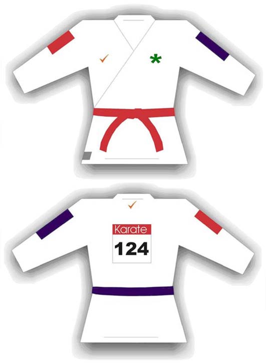 2.6.1. Участники одеты в белые каратэги без полос, отделки кантом или личной вышивки. Эмблема носится на левой стороне груди, на куртке, размеры сторон эмблемы не могут превышать 12 на 8 сантиметров (Приложение N 6). Только ярлыки фирм-производителей могут демонстрироваться на каратэги. Один из участников носит красный пояс (ака), другой - синий пояс (ао). Красный и синий пояса около пяти сантиметров в ширину и имеют длину достаточную, чтобы оставалось пятнадцать сантиметров с каждой стороны узла, но не длиннее трех четвертей длины бедра. Пояса обычного красного или синего цвета без каких-либо личных вышивок, реклам или маркировок, отличных от ярлыка торговой марки производителя.