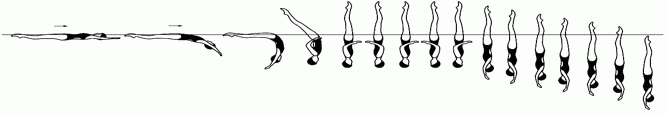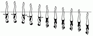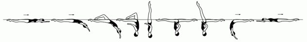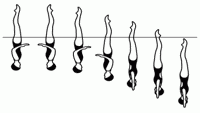 Из позиции "сед углом под водой, ноги вертикально", сохраняя ноги вертикально выполняется выталкивание в позицию "Вертикаль", после чего выполняется резкий поворот на 180* (не теряя высоты), вертикальное погружение.