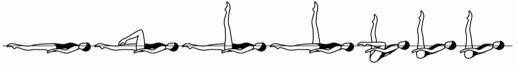 Из положения лежа на спине выполняется заход в "Запятую с согнутой ногой" (Нова). Затем выполняется резкий поворот на 180* с одновременным подъемом ног в положение "Вертикаль". После чего выполняется одновременное, симметричное разведение ног в позицию "Шпагат". Далее закрывание передний ноги в позицию "Запятая" и выплыв в положение "лежа на спине".