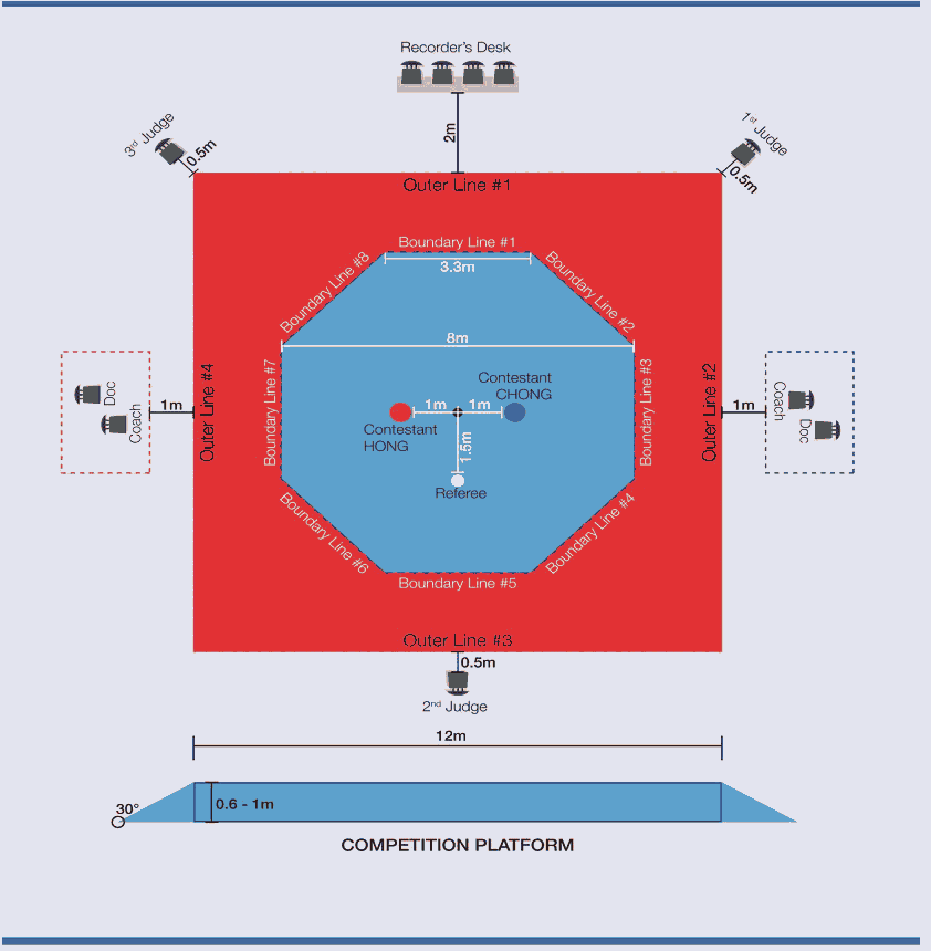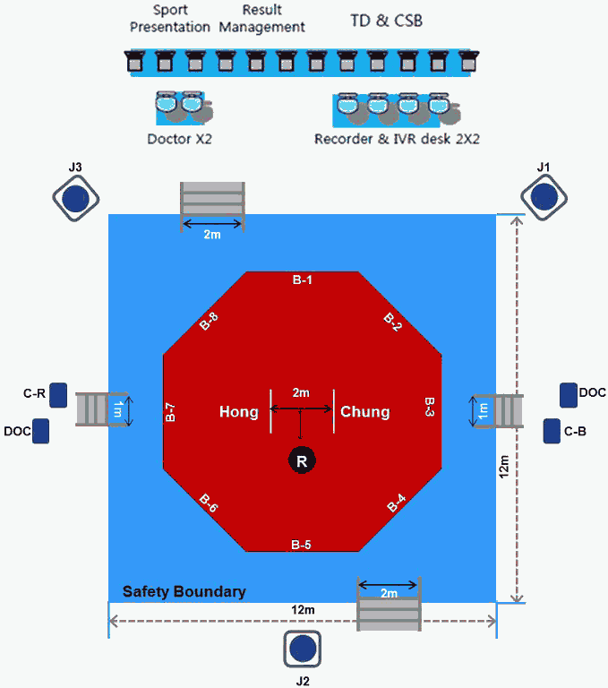 Примечание: если спортсмен выталкивает другого спортсмена за Доянг (без применения технического элемента, то есть толкая руками или туловищем), то замечание дается тому, кто толкает.