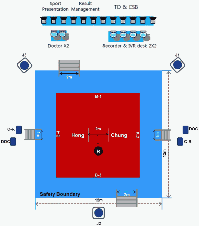 РЕФЕРИ ВЫЗЫВАЕТ СПОРТСМЕНОВ ПО ОЧЕРЕДИ - КРАСНЫЙ (HONG) и СИНИЙ (CHONG).
