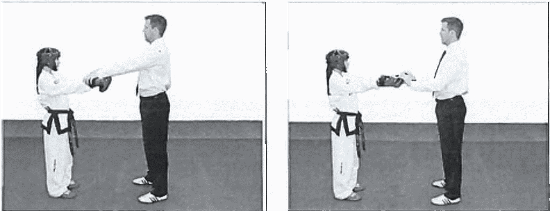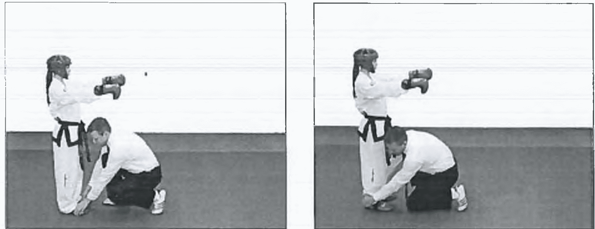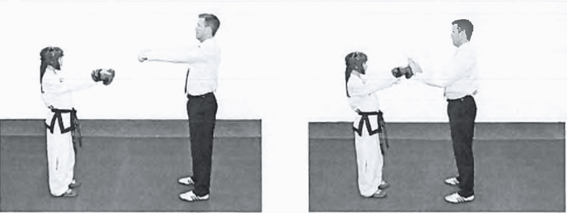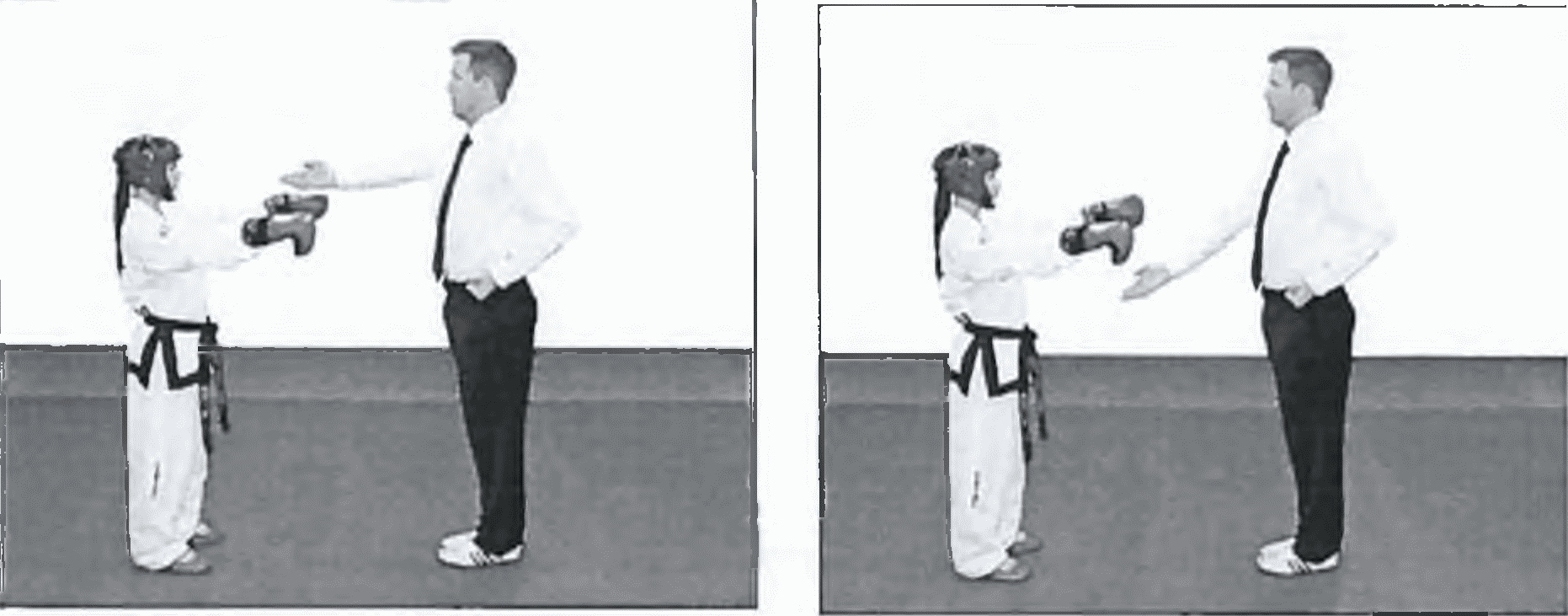 Рефери делает шаг назад в стойку ходьбы "гуннун соги", поднимая одну руку вверх, указательным пальцем вверх, или выполняя им круговое движение, и другой рукой указывает на нарушителя.