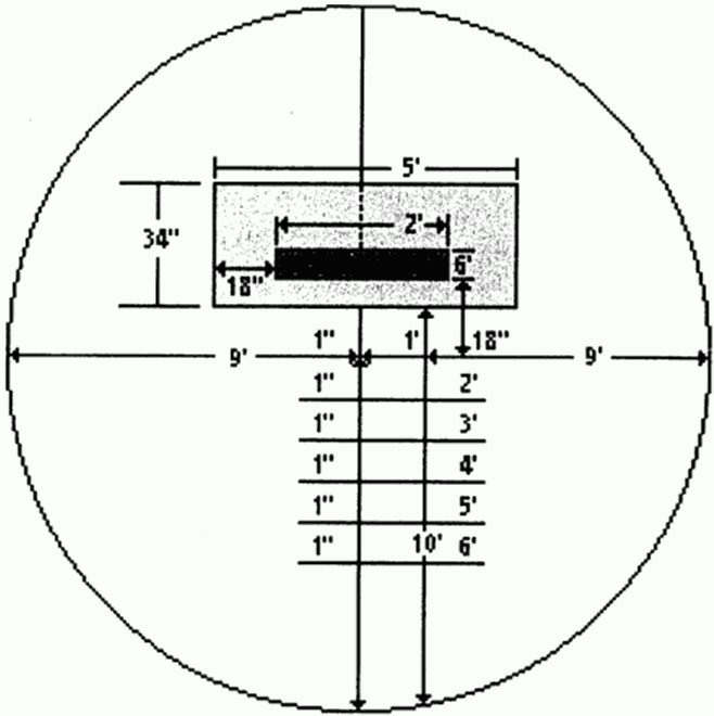Уровень уклона от точки, расположенной на 15,24 см (6 дюймов) перед пластиной питчера до точки, расположенной на 1,83 м (6 футов) в сторону "дома", должно составлять 2,54 см на 30,48 см (1 дюйм на 1 фут), уклон равномерный. Горка питчера - окружность диаметром 5,49 м (18 футов), центр которой отстоит от "дома" на 17,98 м (59 футов). Резиновая пластина располагается в 45,72 см (18 дюймов) за центром горки. Передняя грань пластины отстоит от задней точки дома на 18,44 м (60 футов 6 дюймов). Уклон начинается на расстоянии 15,24 см (6 дюймов) от передней грани пластины и равномерно продолжается до 1,83 м (6 футов), составляя перепад высот 15,24 см (6 дюймов). Окружающая пластину питчера плоскость должна быть: 15,24 см (6 дюймов). перед пластиной, 45,72 см (18 дюймов) по бокам и 55,88 см (22 дюйма) сзади. Размер плоской площадки - 152,4 см х 86,36 см (5 футов на 34 дюйма).