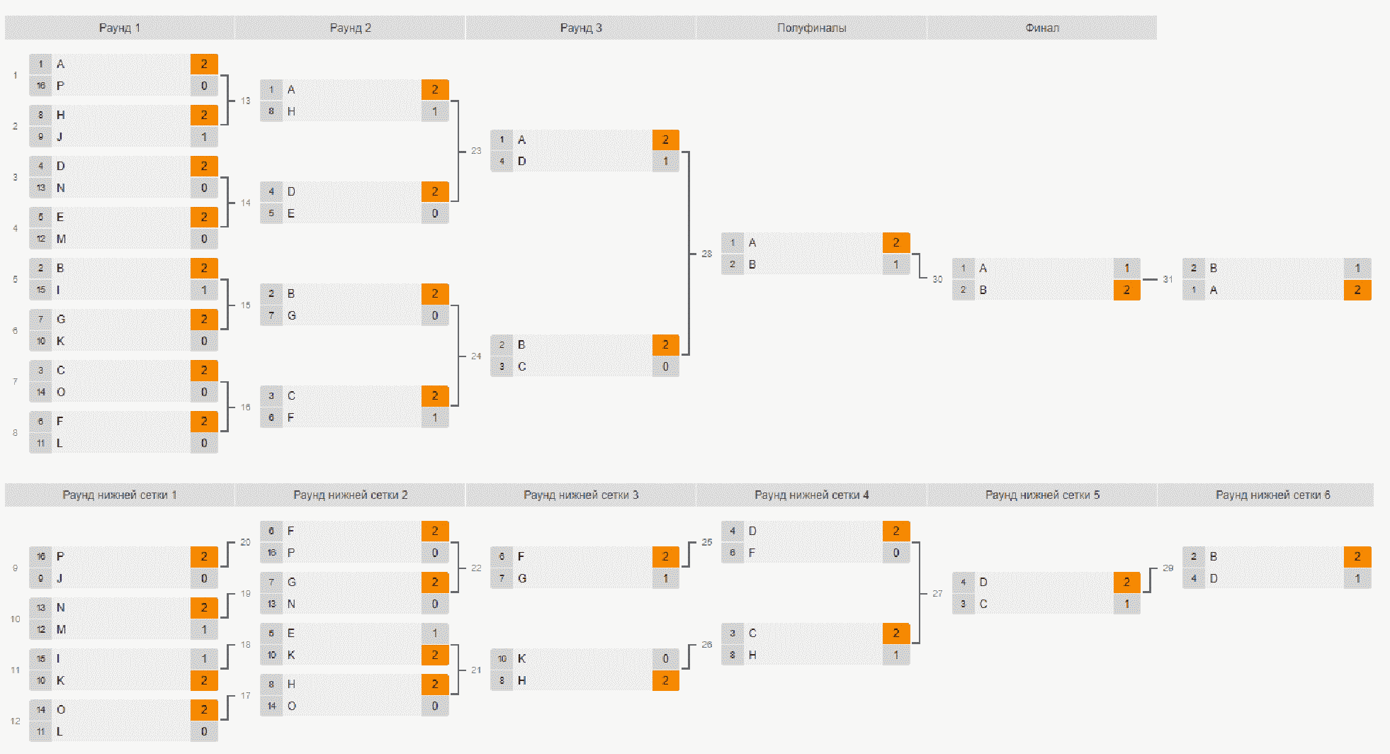 1.4.5. Олимпийская система с выбыванием после двух поражений - система, при которой участник соревнований, проигравший первый матч, попадает в нижнюю сетку, а после второго поражения выбывает из дальнейшего участия в данных соревнованиях.