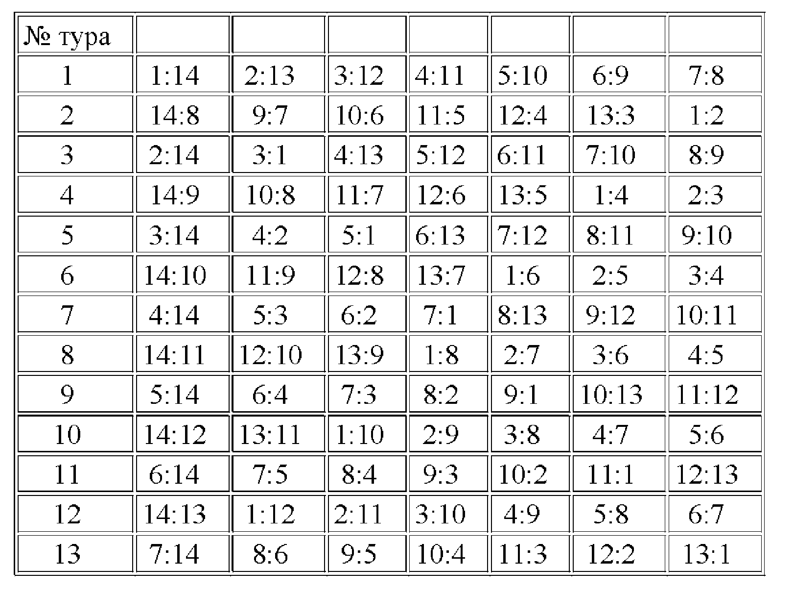 1.4.3. Круговая система - система, при которой каждый участник соревнований поочередно встречается со всеми остальными участниками в один или несколько кругов (п. 8.2.1). Очередность туров может быть изменена по мотивированному решению Главного судьи соревнований или лица его замещающего.