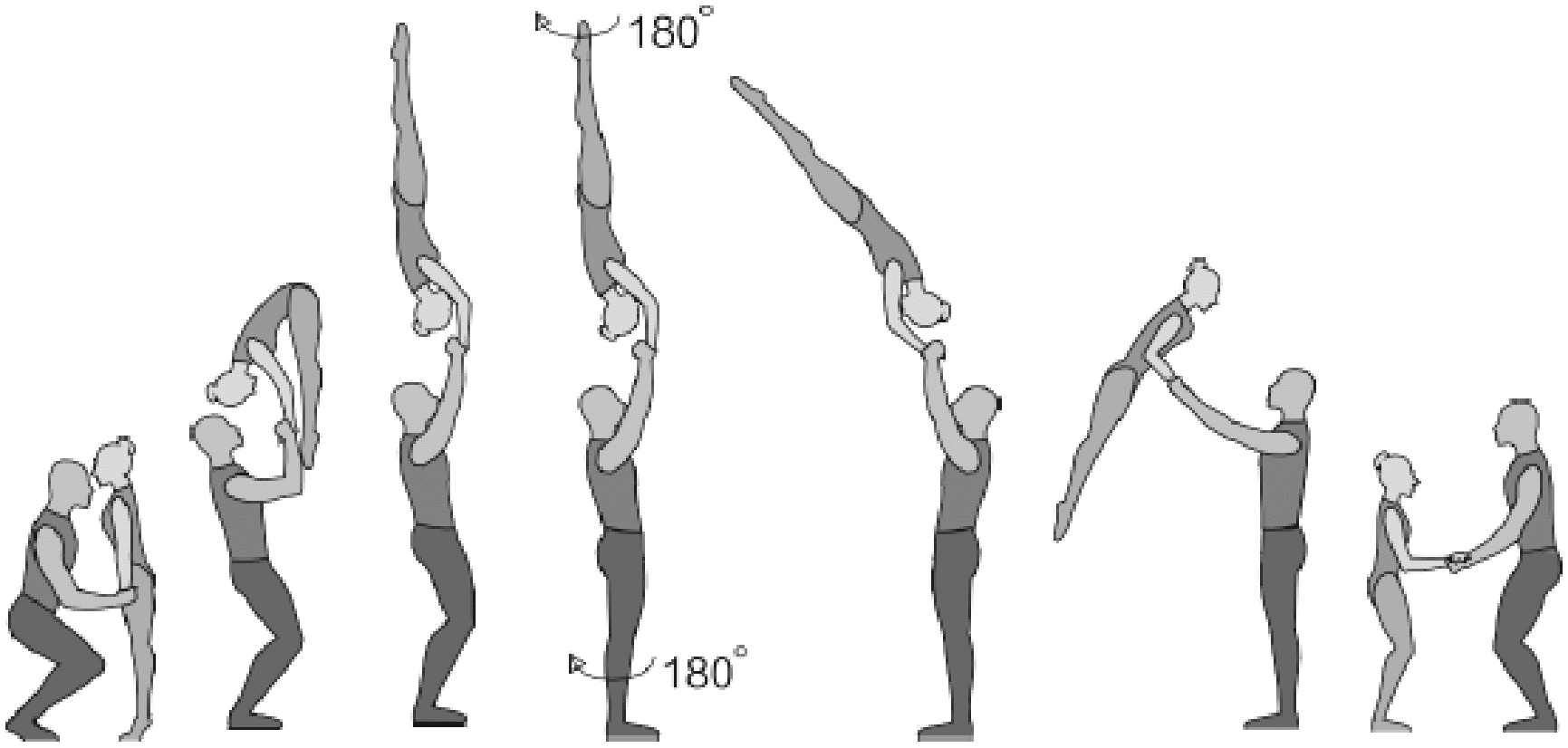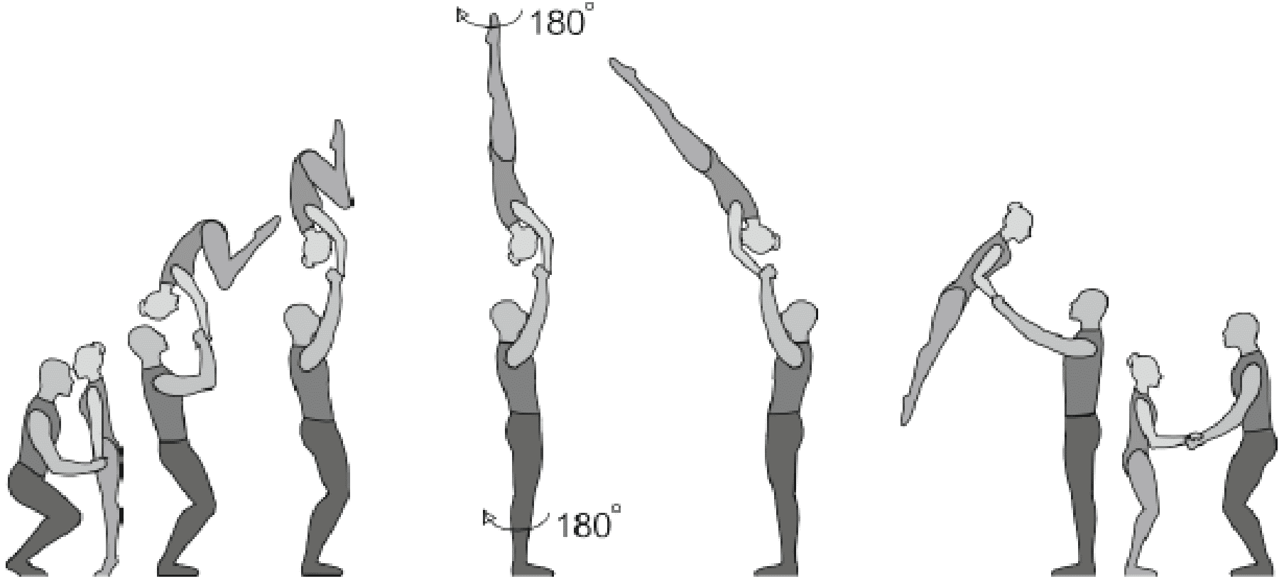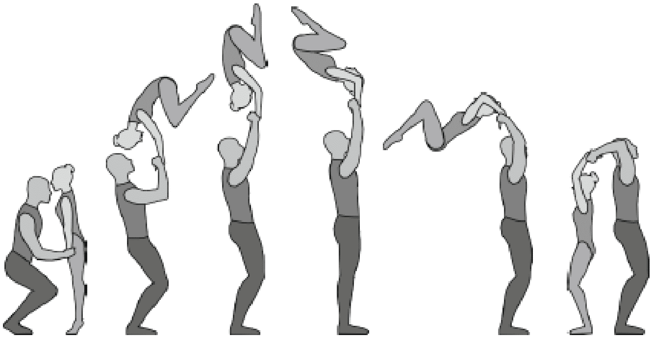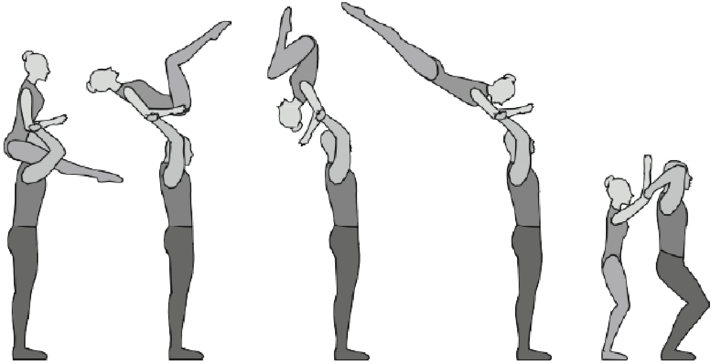 Старт с двух партнеров, поворот на 180°, 5/4 сальто вперед согнувшись с поворотом на 180°, приземление в руки партнеров лежа на спине