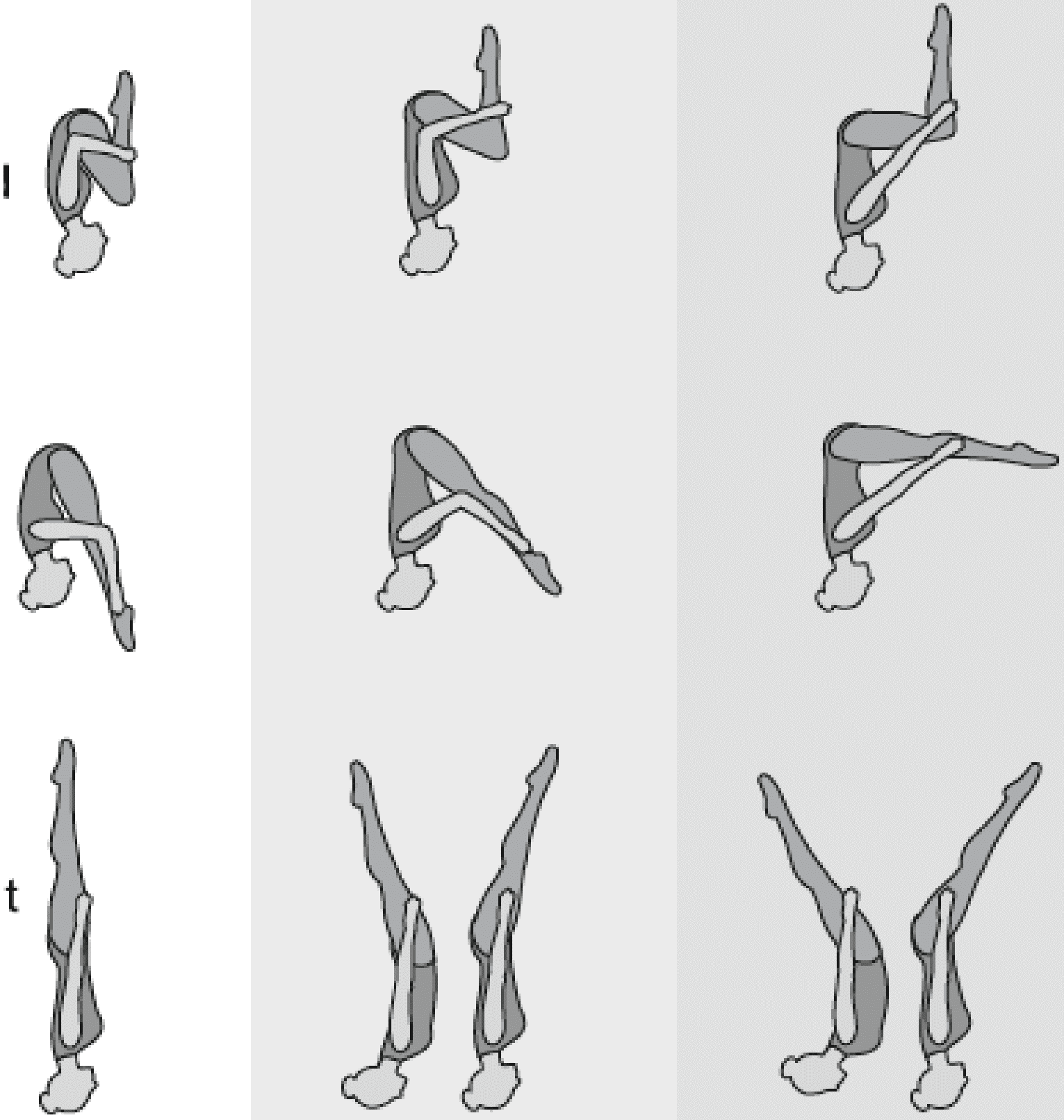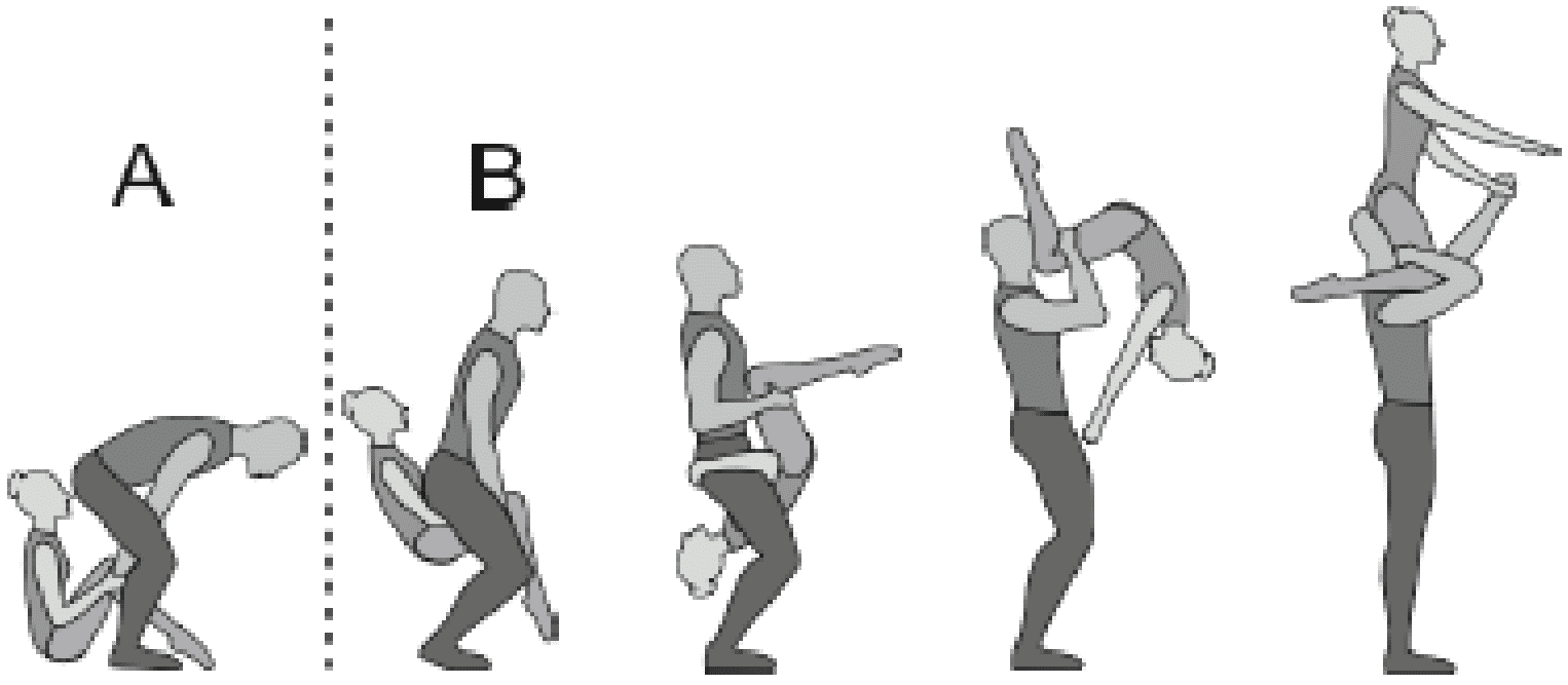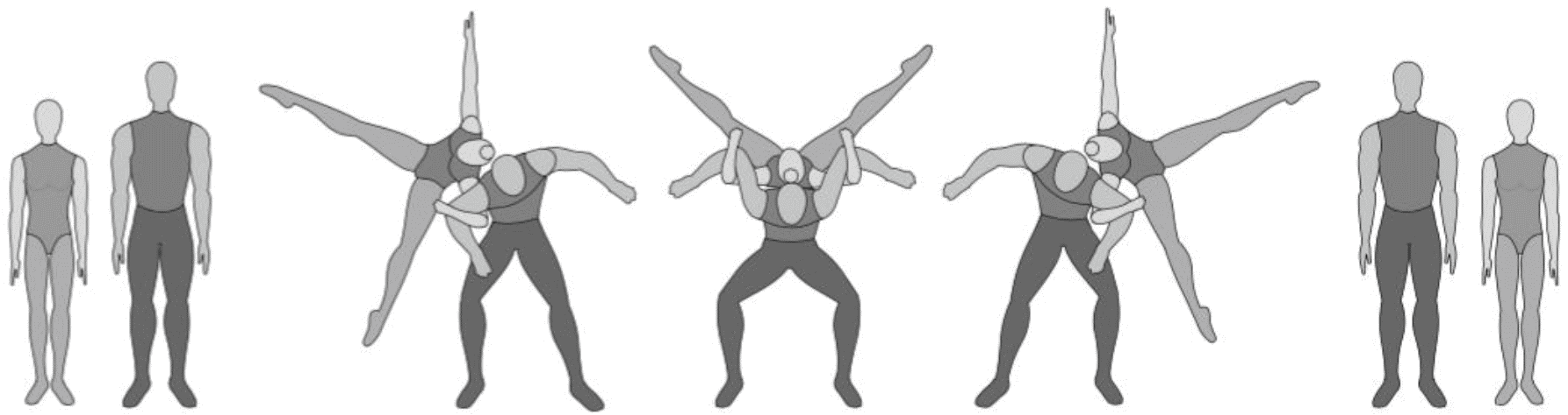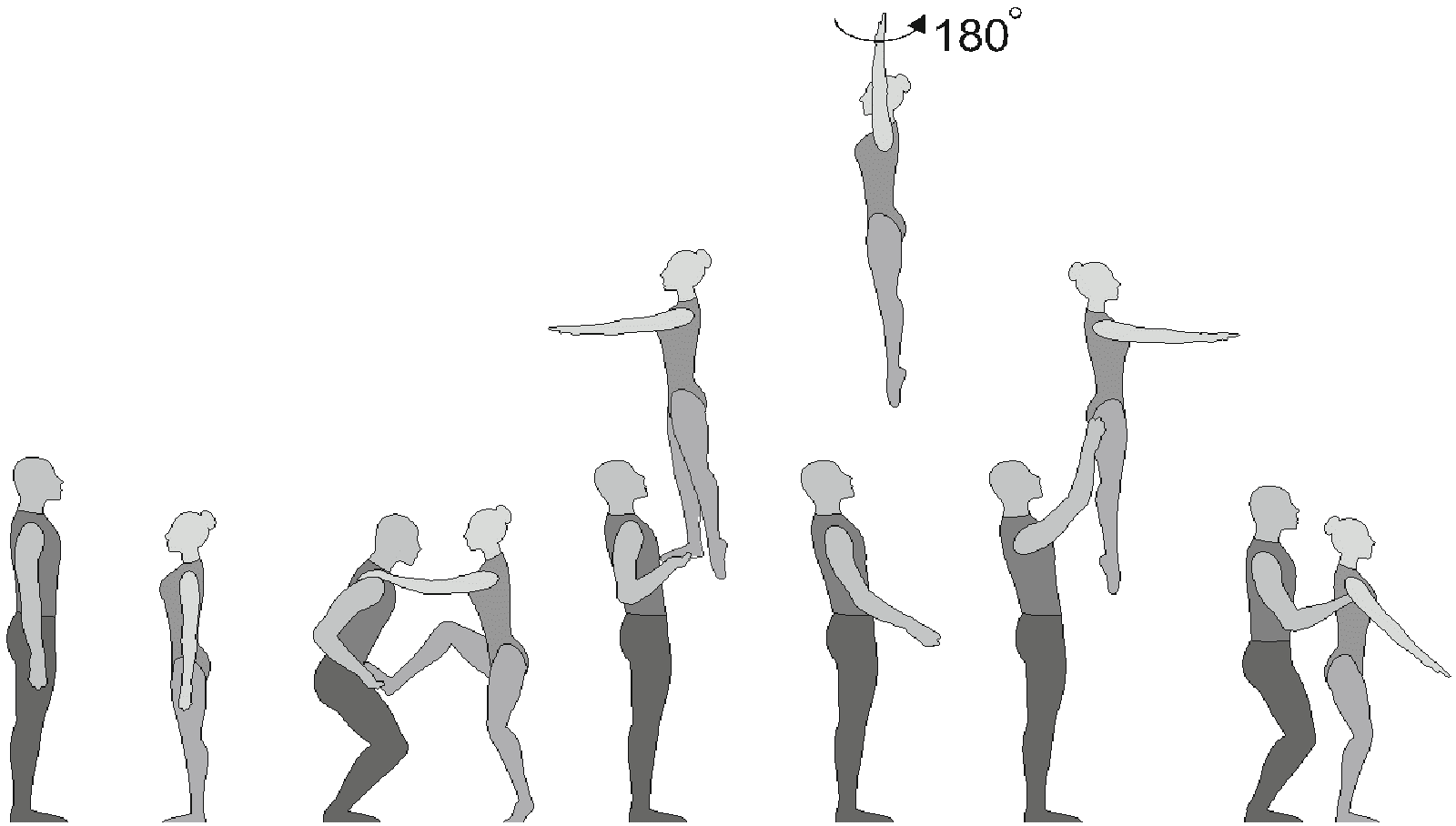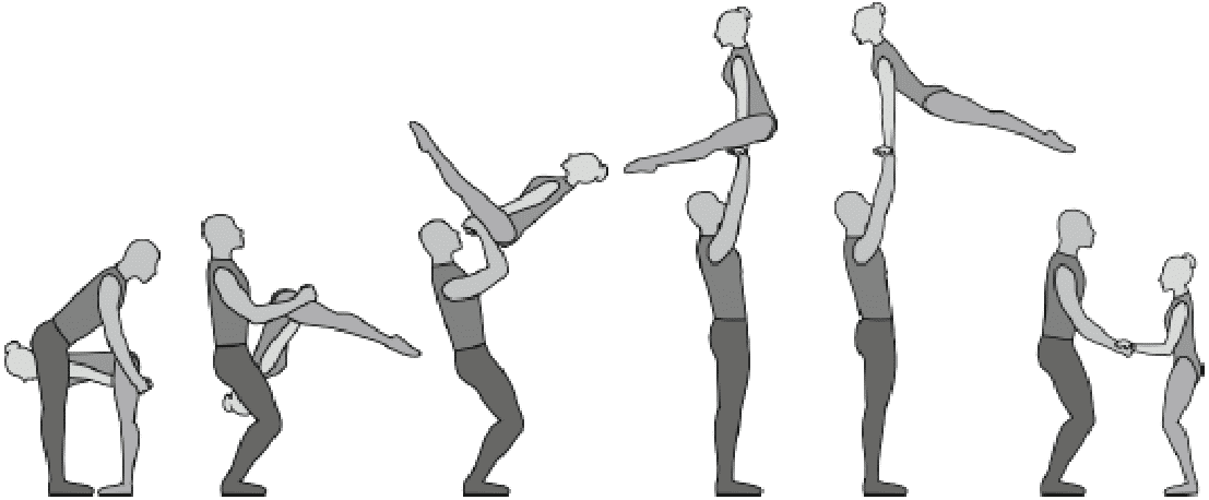 Старт с двух партнеров, поворот на 180°, 5/4 сальто вперед согнувшись с поворотом на 180°, приземление в руки партнеров лежа на спине
