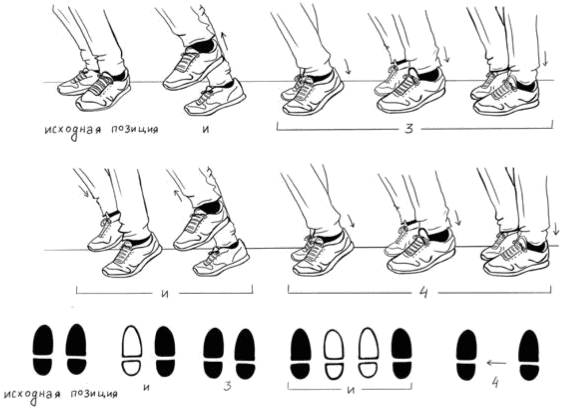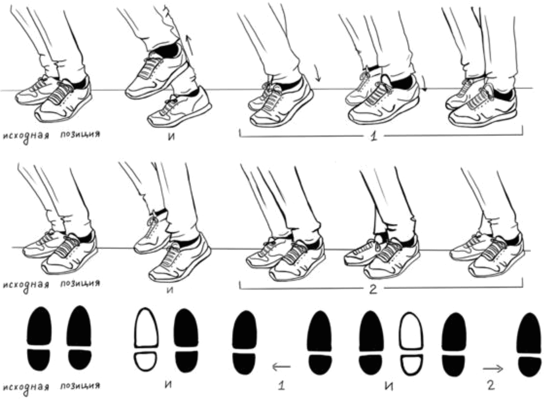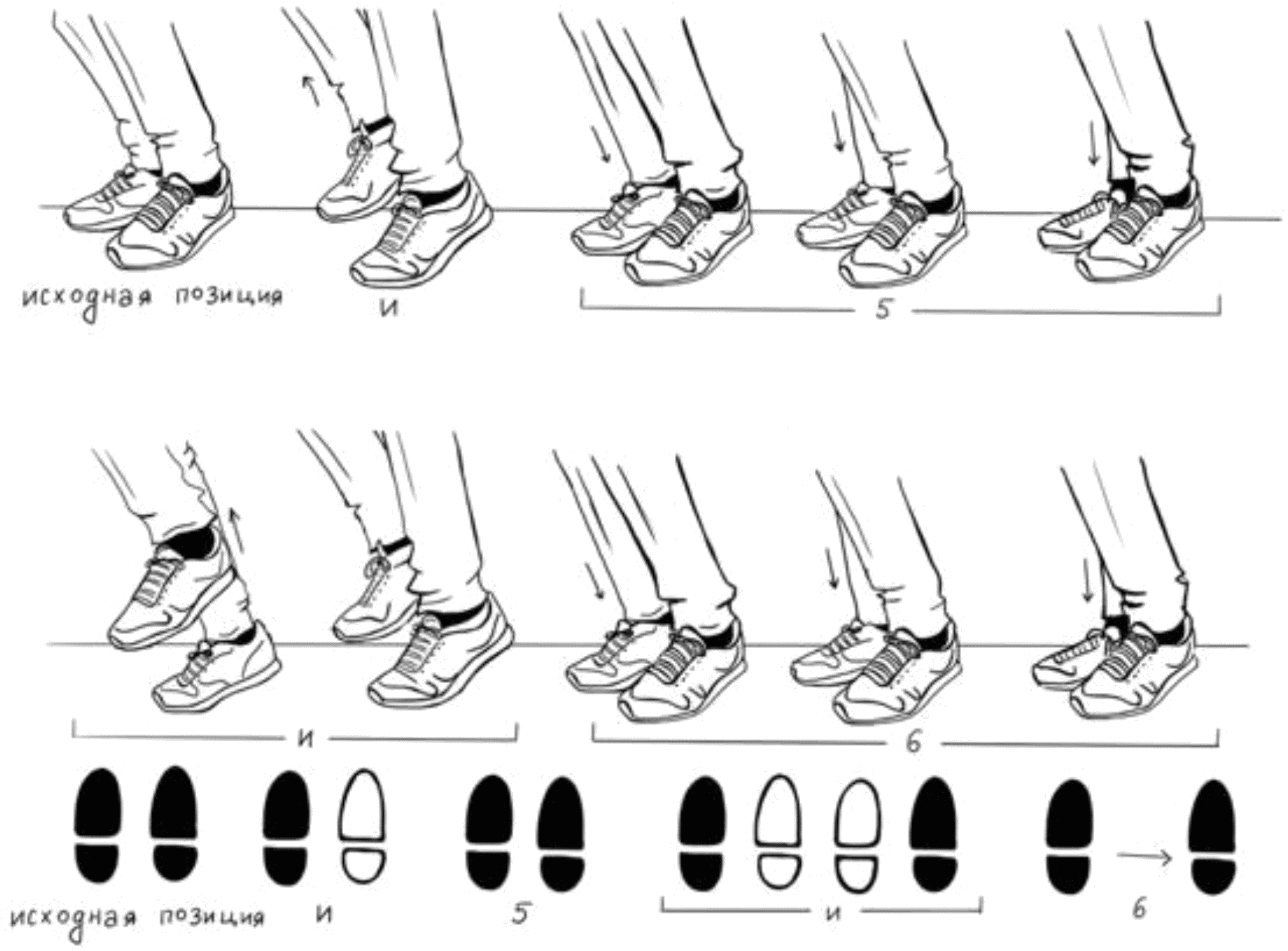 1.17.1. выпрямление рабочей ноги в слабую долю (на счет 2 и 4 такта), постановка - в сильную долю (на счет 1 и 3 такта) при исполнении основного хода и его вариаций;