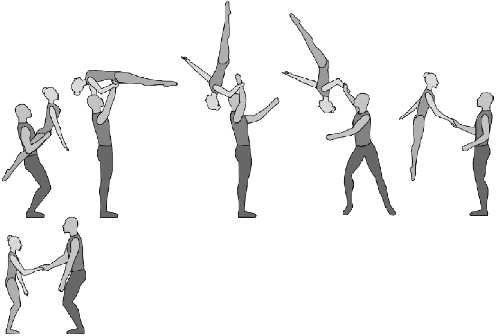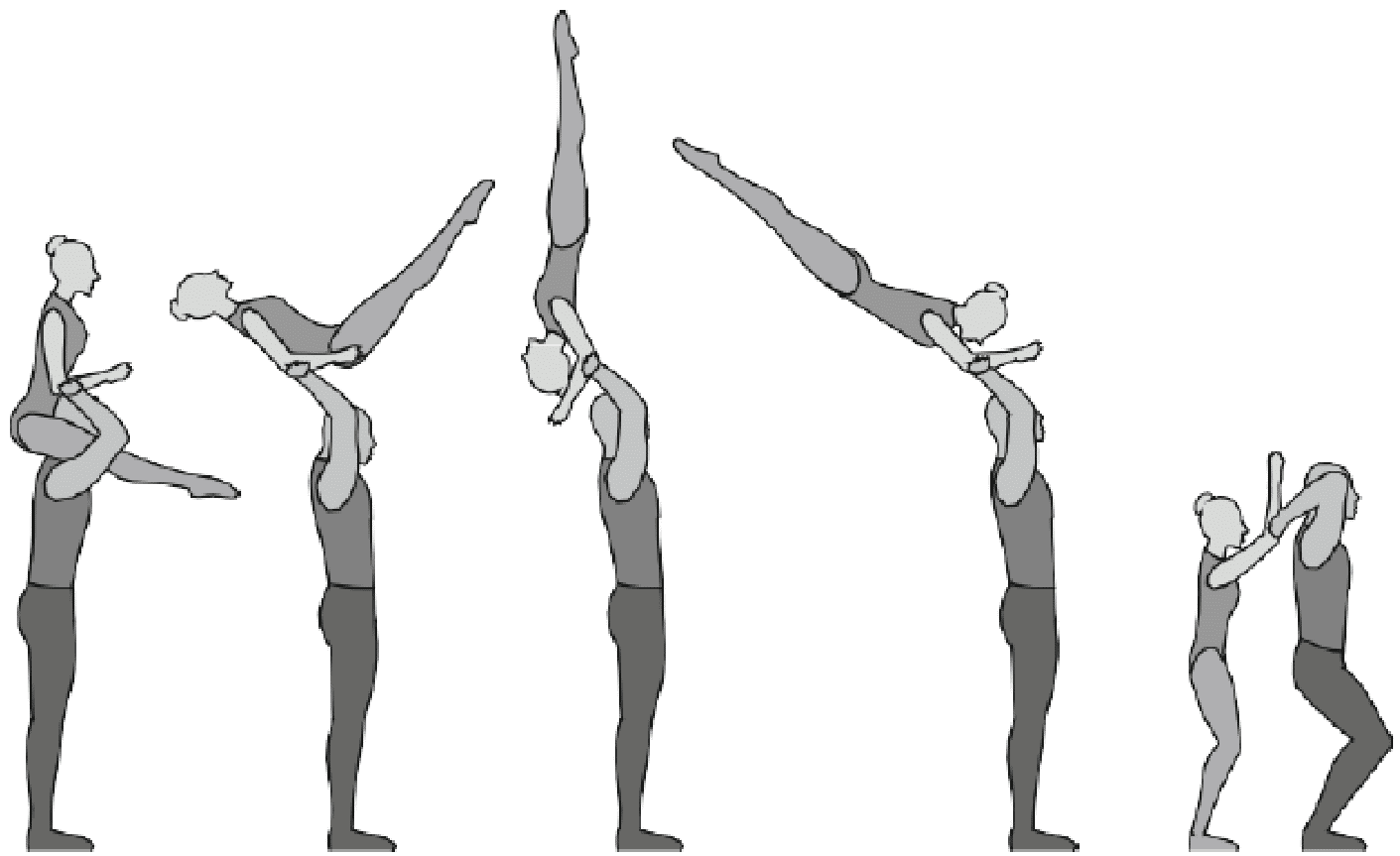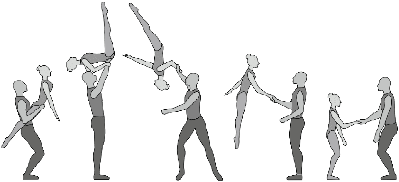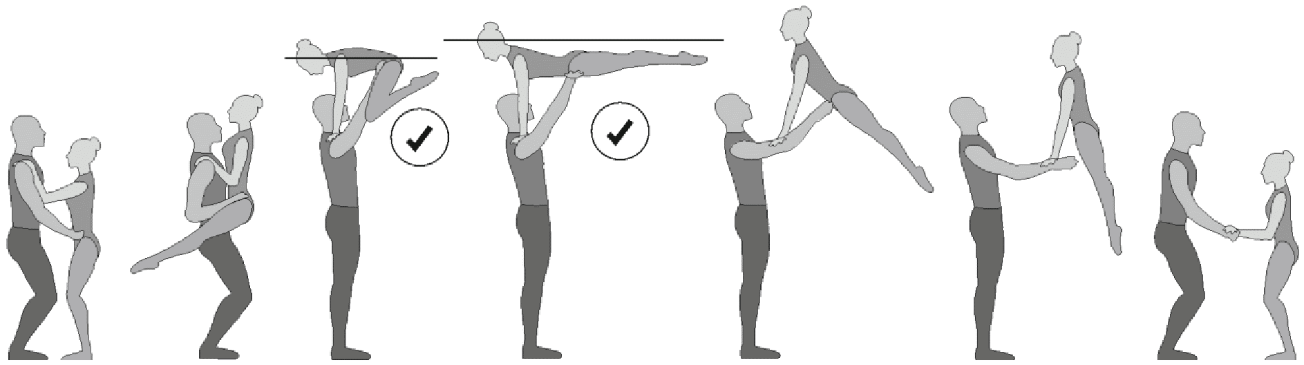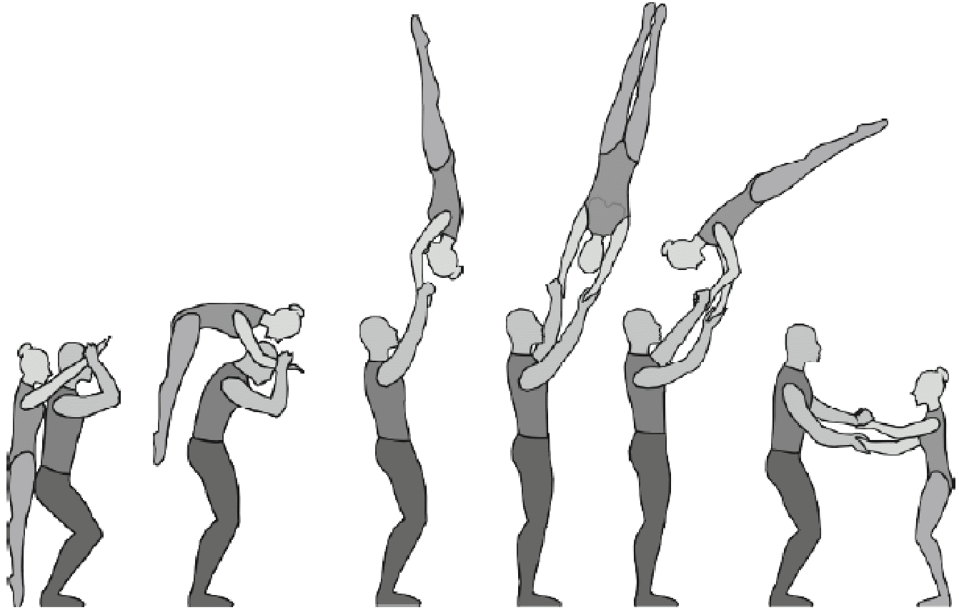 1.36. Формейшн-акробатика - один партнер поднимает/подбрасывает партнершу, а другой ее ловит. Должно исполняться всеми партнершами, при этом промежуточное перестроение не должно длиться более 2-х тактов.