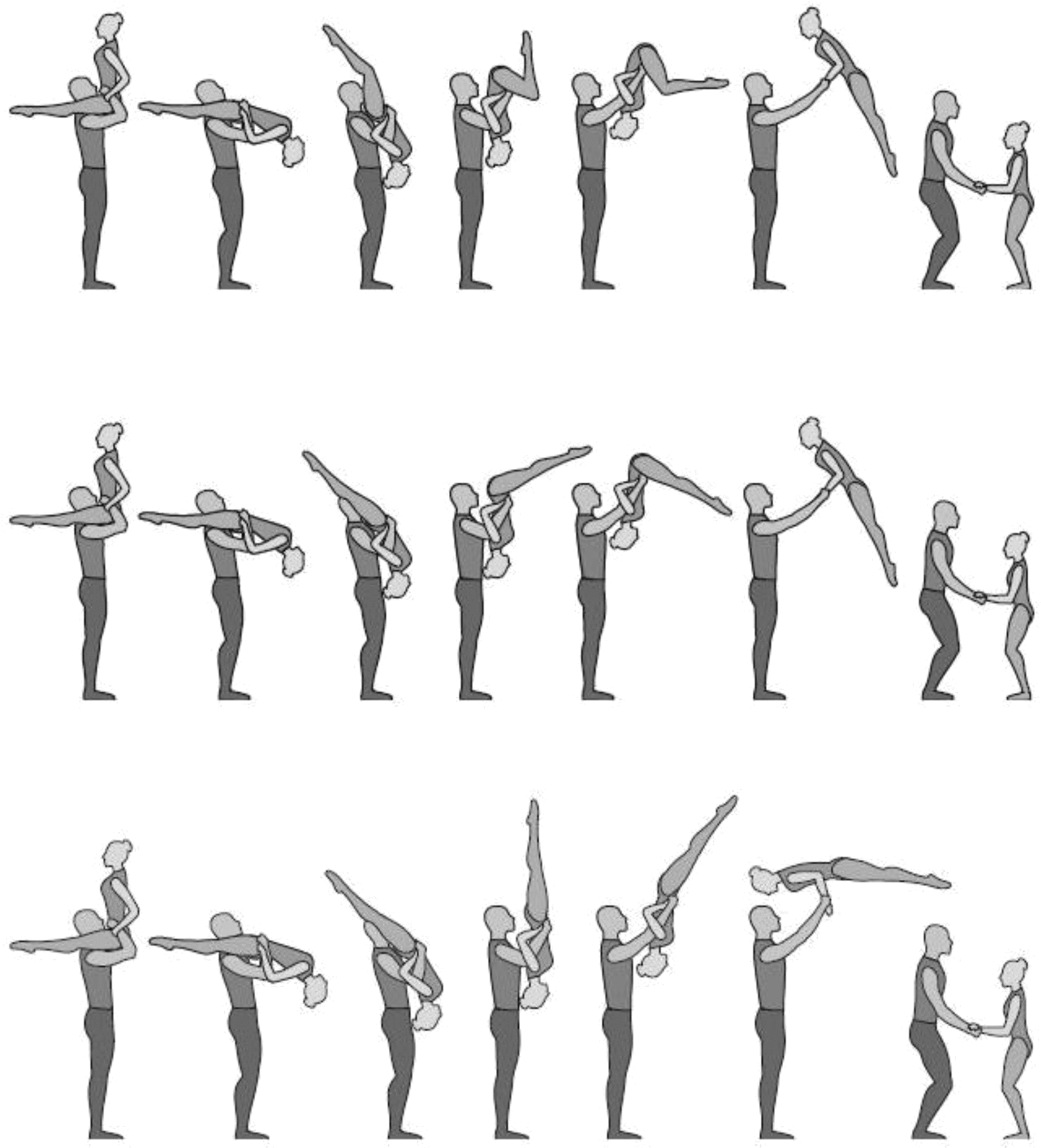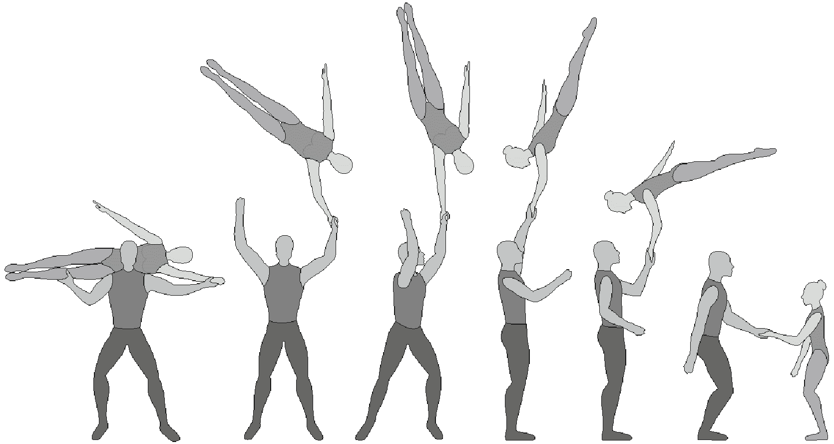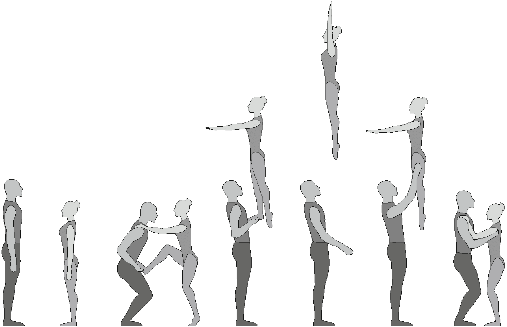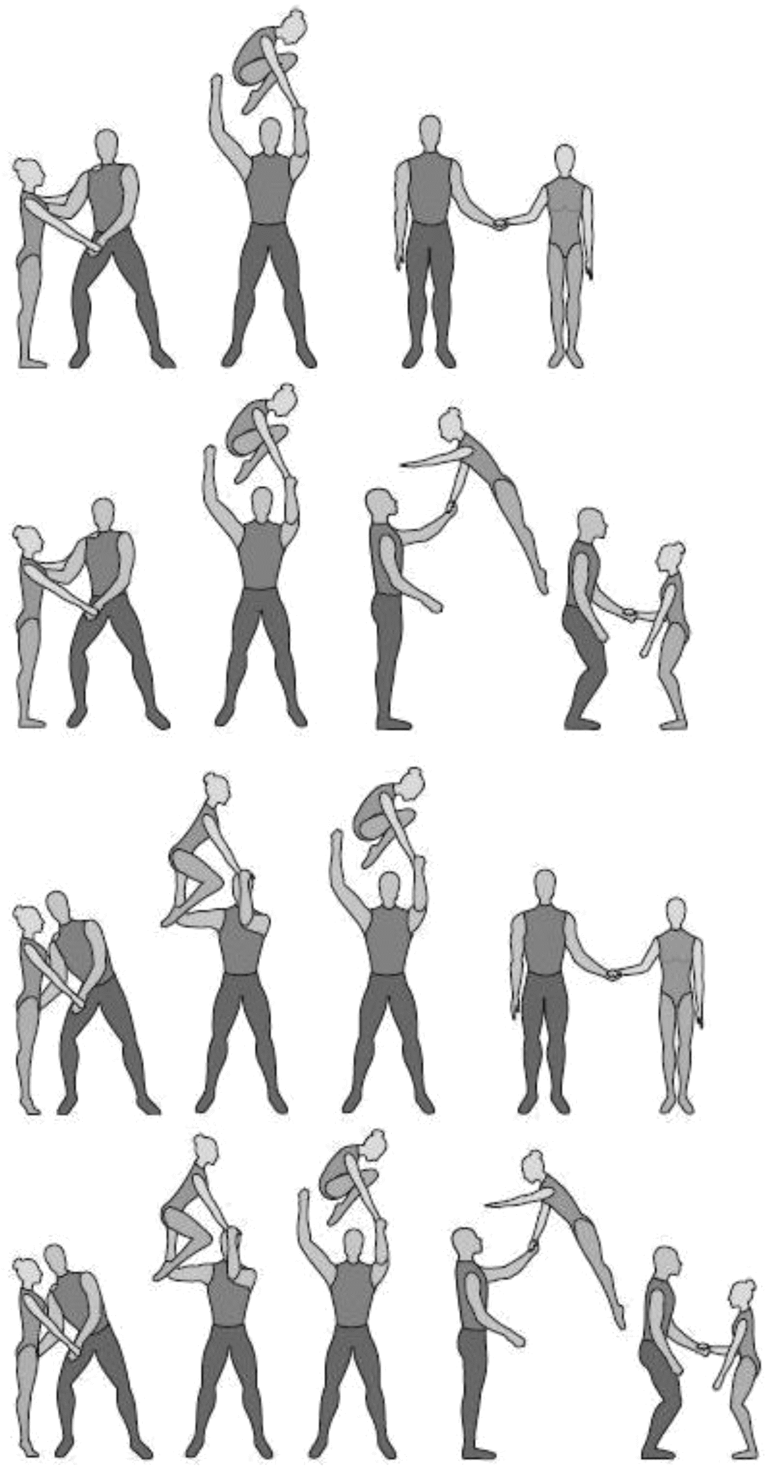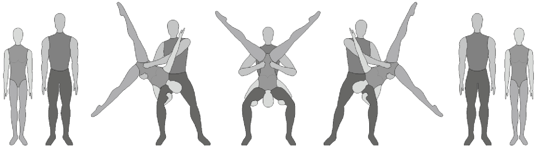 1.36. Формейшн-акробатика - один партнер поднимает/подбрасывает партнершу, а другой ее ловит. Должно исполняться всеми партнершами, при этом промежуточное перестроение не должно длиться более 2-х тактов.