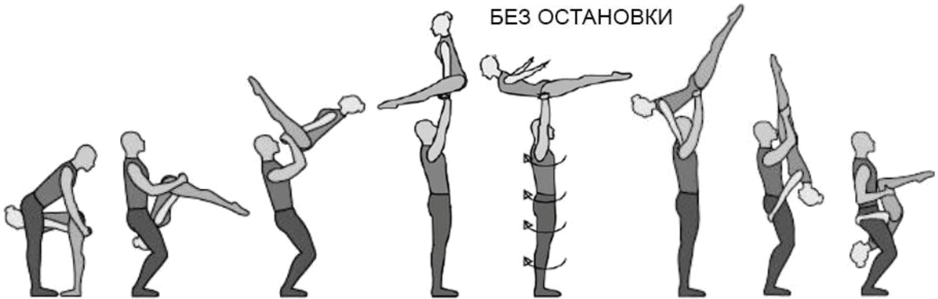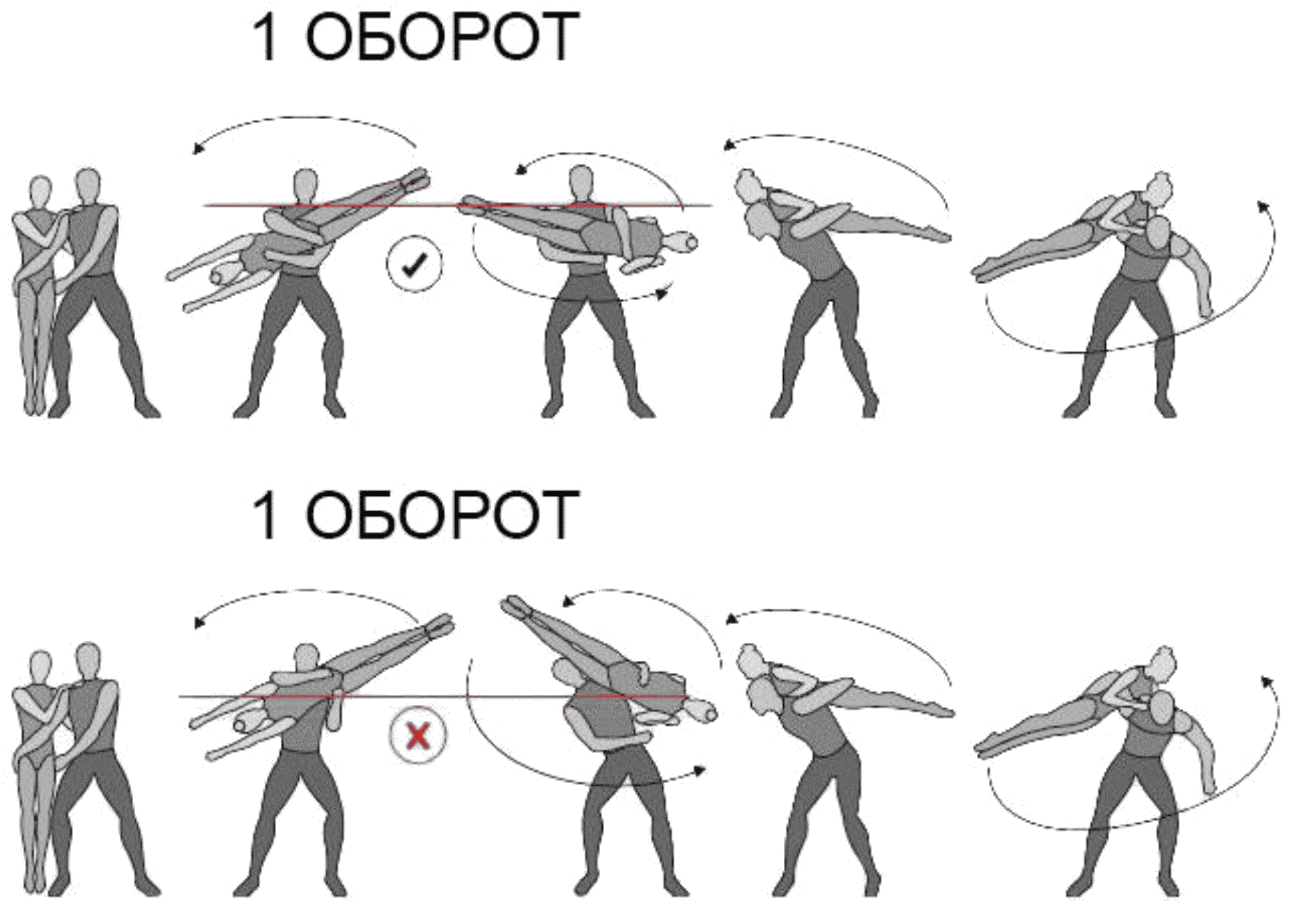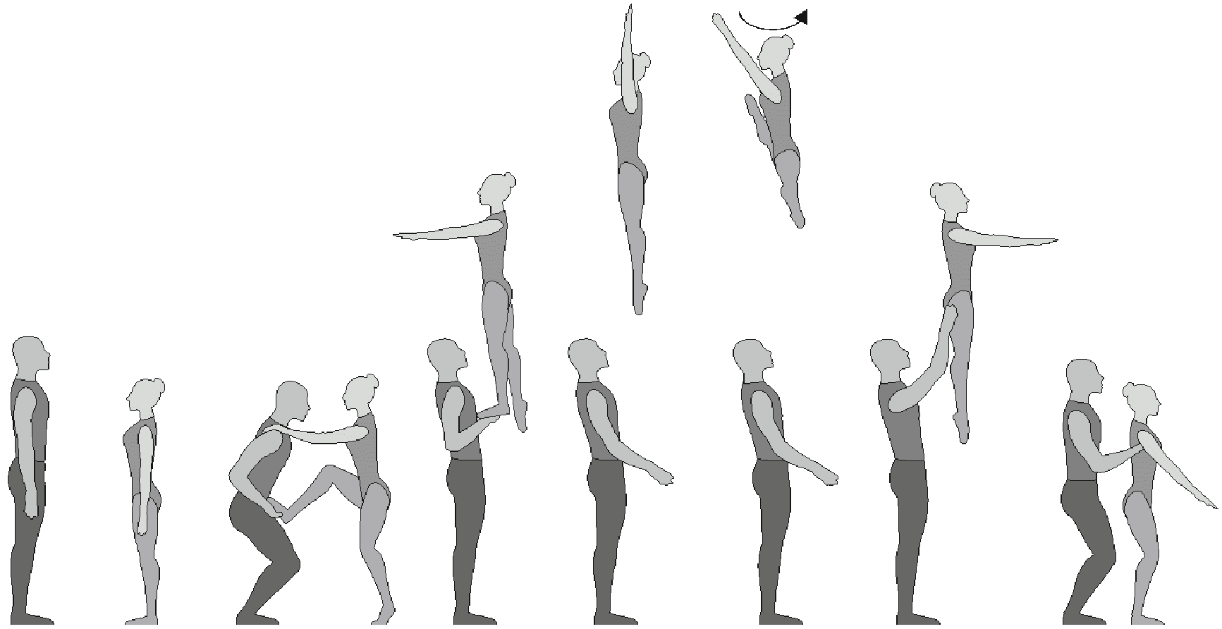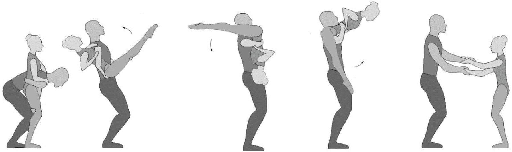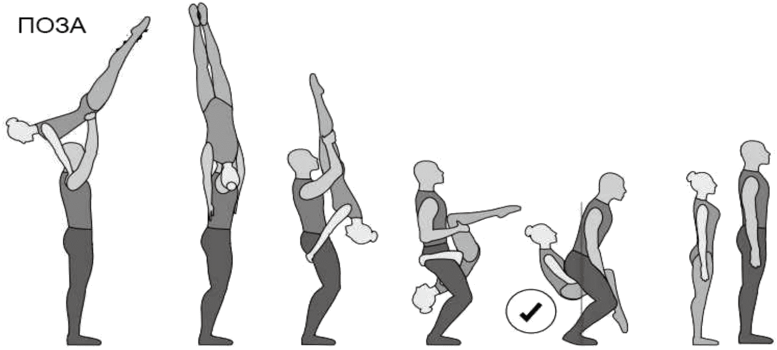 1.28. Элементы-вращения - специфические акробатические элементы, выполняемые в контакте с партнером и представляющие собой вращение партнерши партнером вокруг своего тела или его частей.