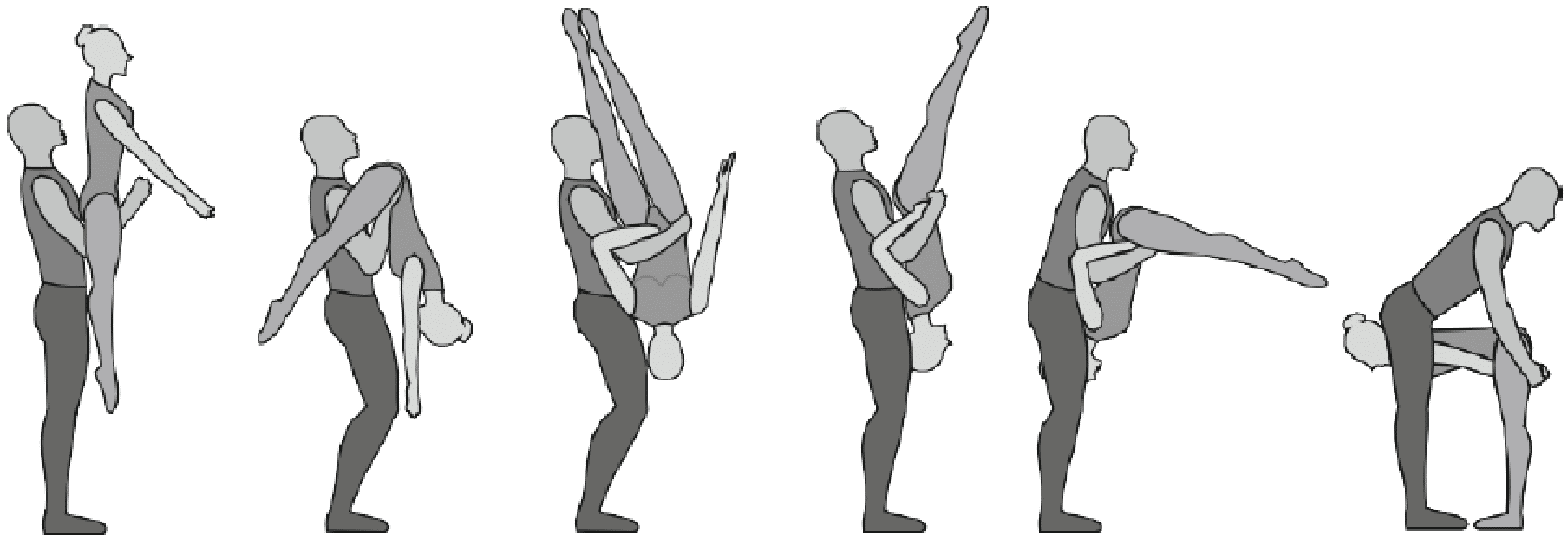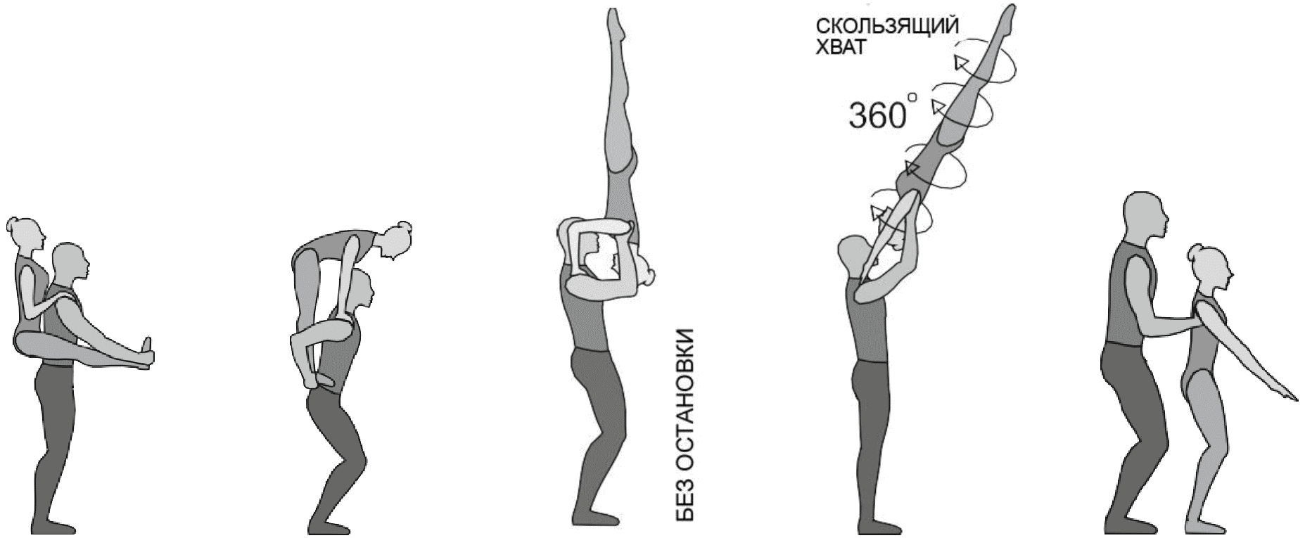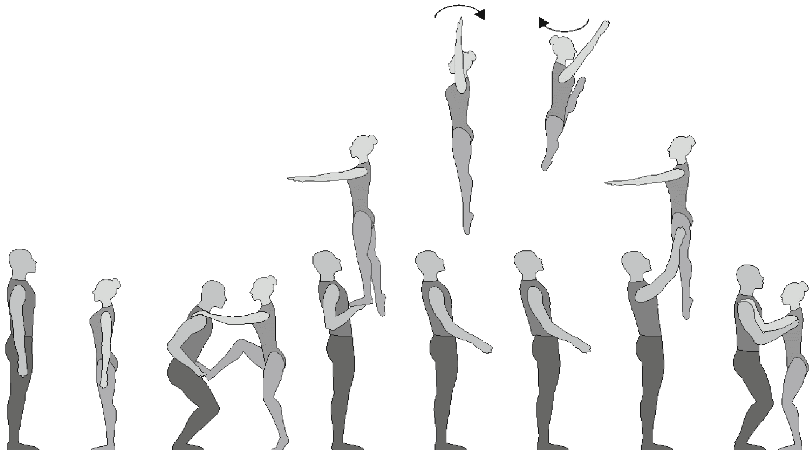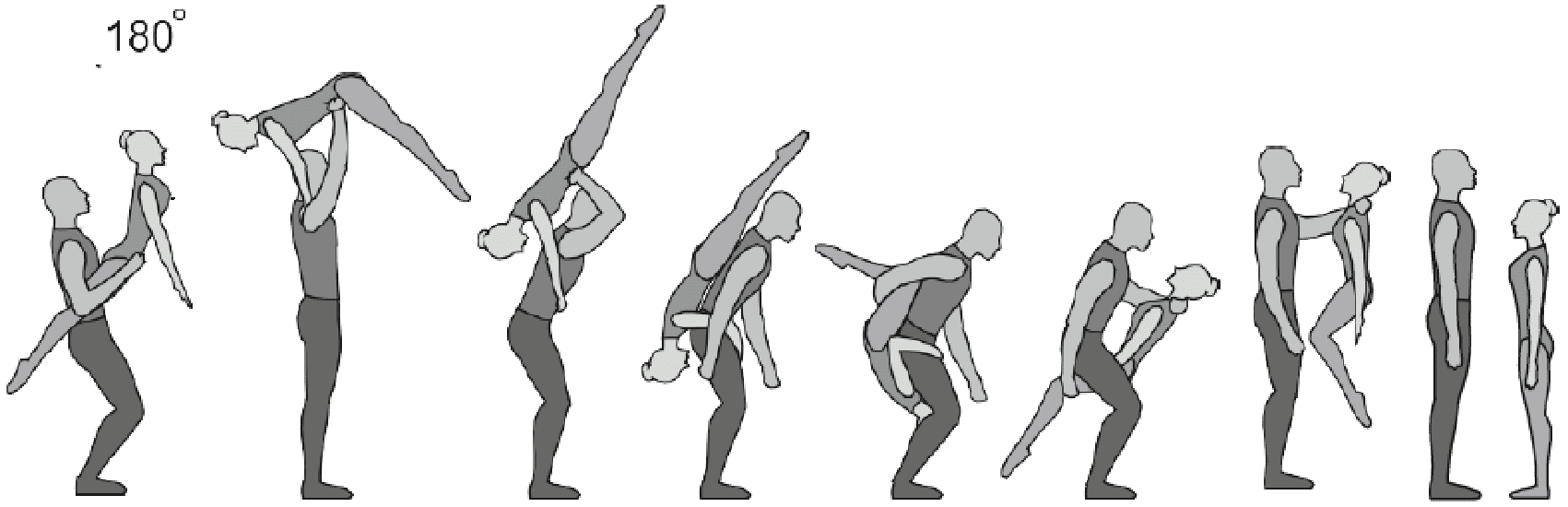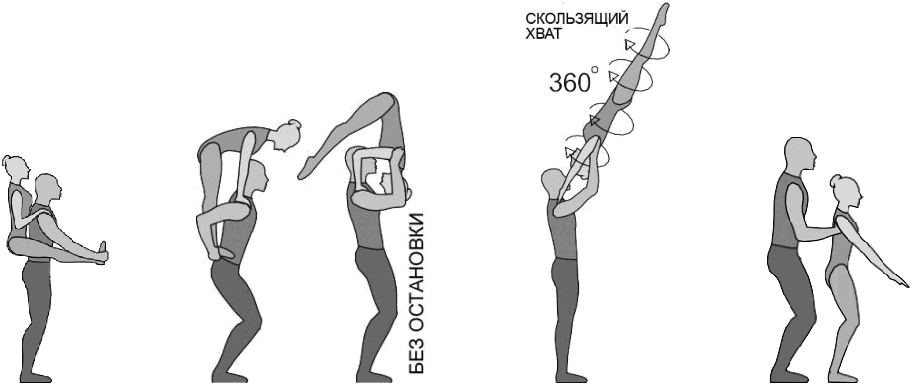 1.28. Элементы-вращения - специфические акробатические элементы, выполняемые в контакте с партнером и представляющие собой вращение партнерши партнером вокруг своего тела или его частей.