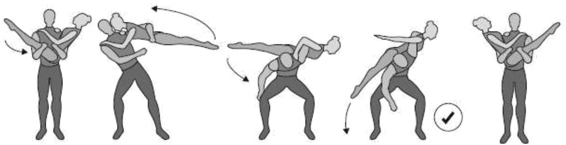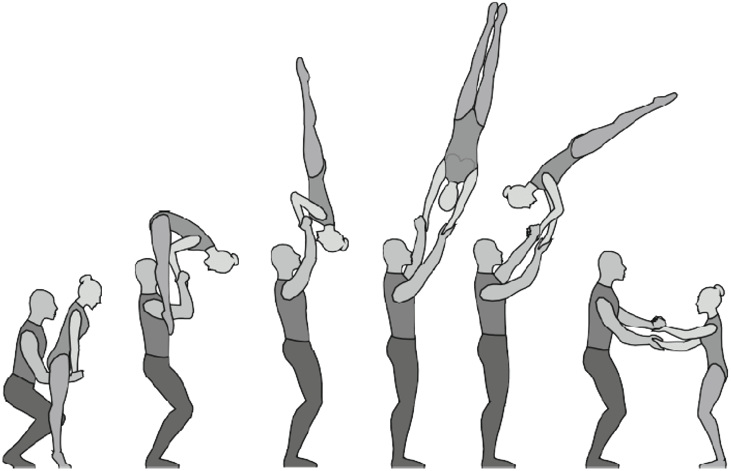 Старт с двух партнеров, 5/4 сальто вперед в группировке с поворотом на 180°, приземление в руки партнеров лежа на спине
