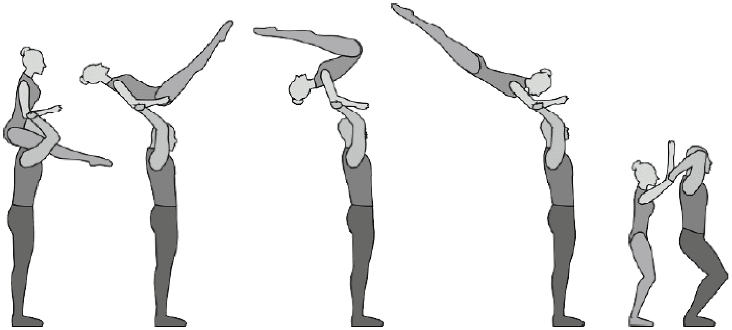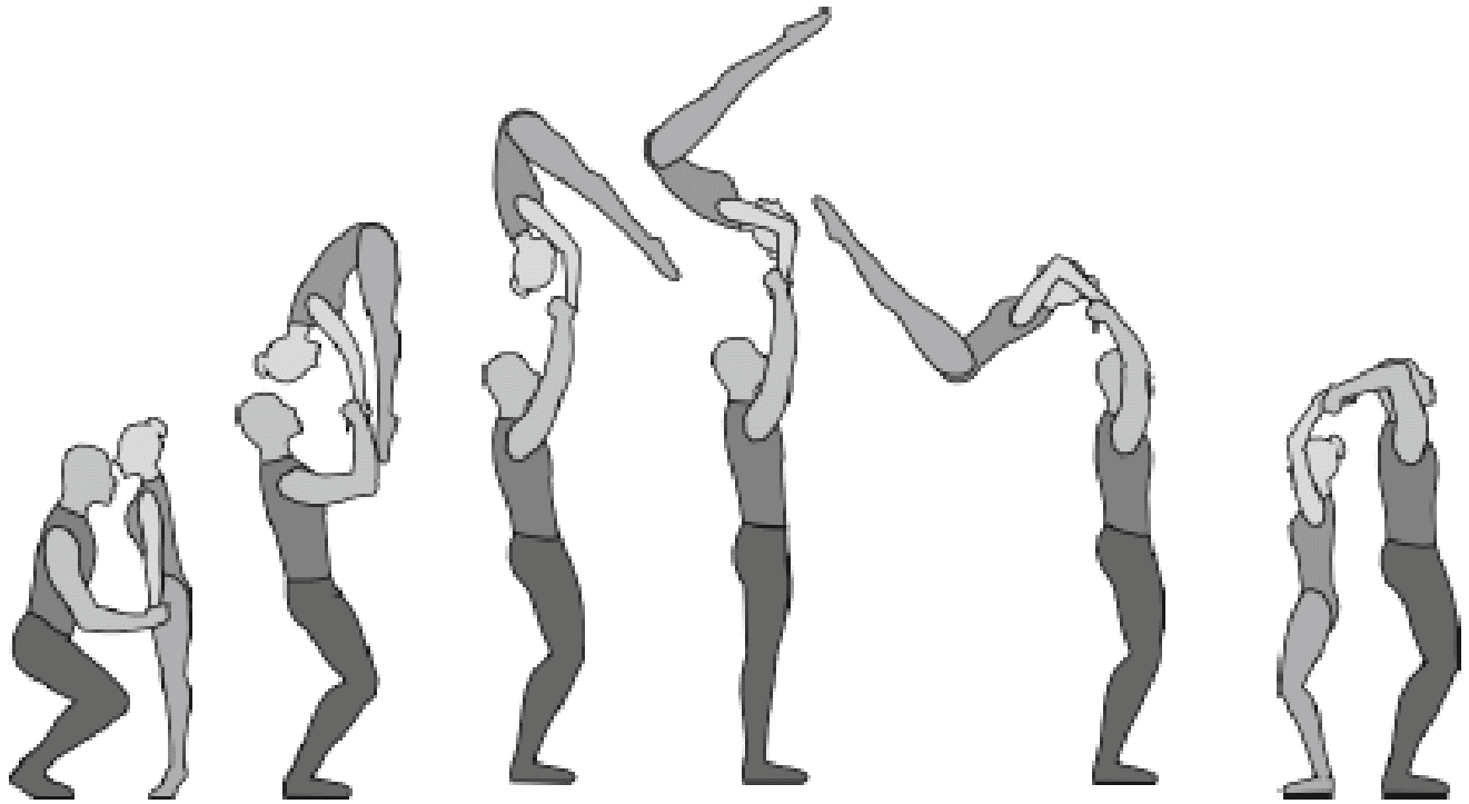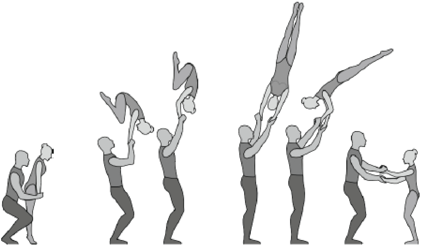 Старт с двух партнеров, поворот на 180°, 5/4 сальто вперед в группировке, приземление в руки партнеров лежа на животе