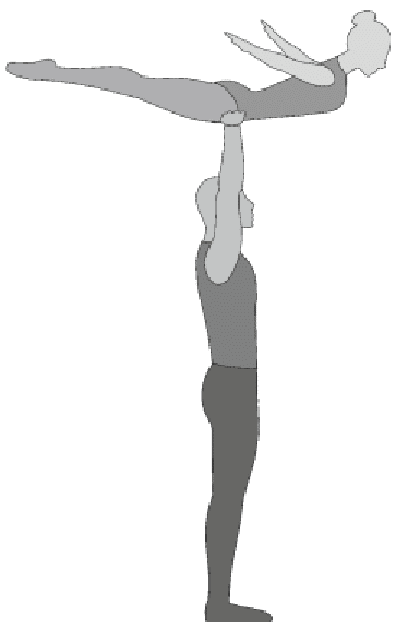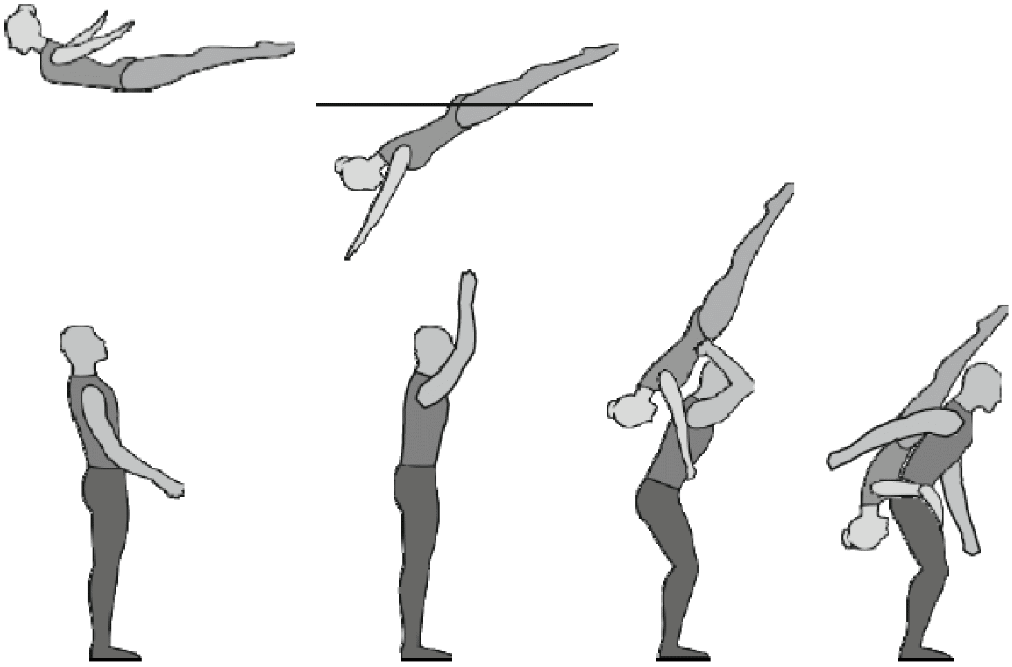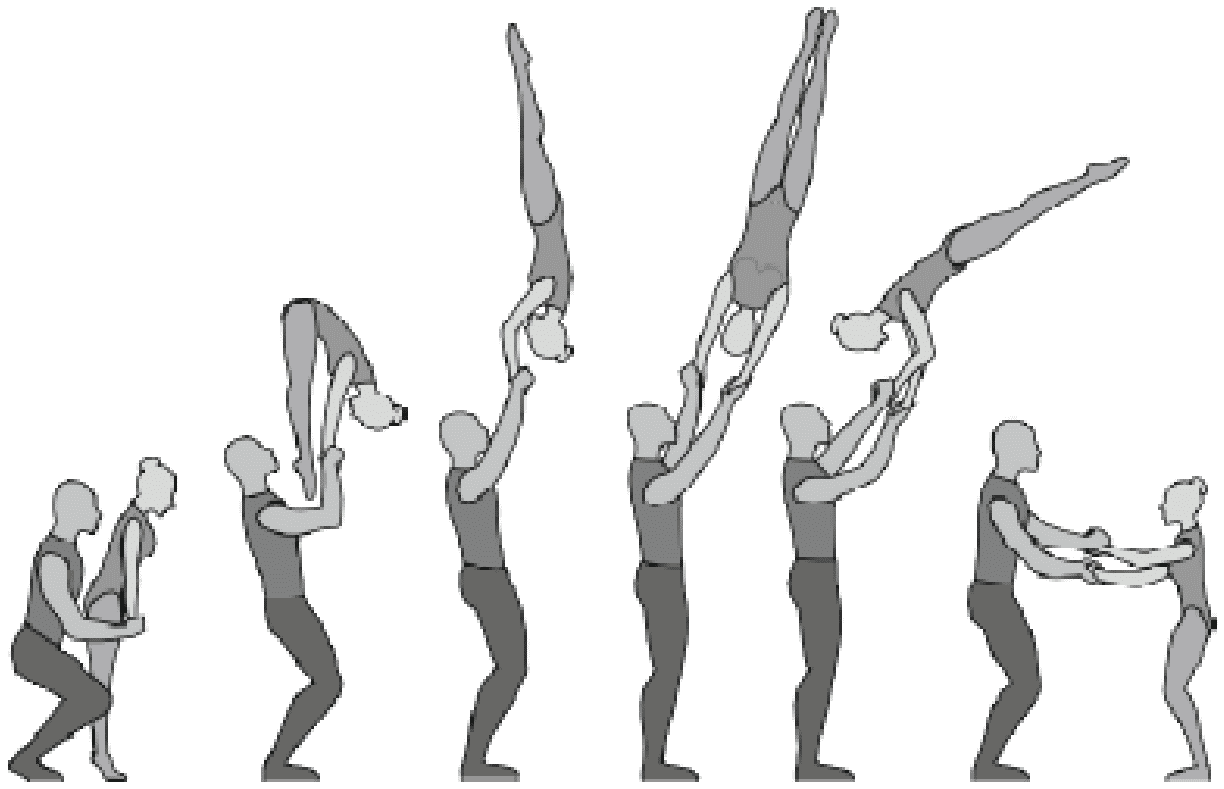 Старт с двух партнеров, 5/4 сальто назад прогнувшись с поворотом на 180°, приземление в руки партнеров лежа на животе