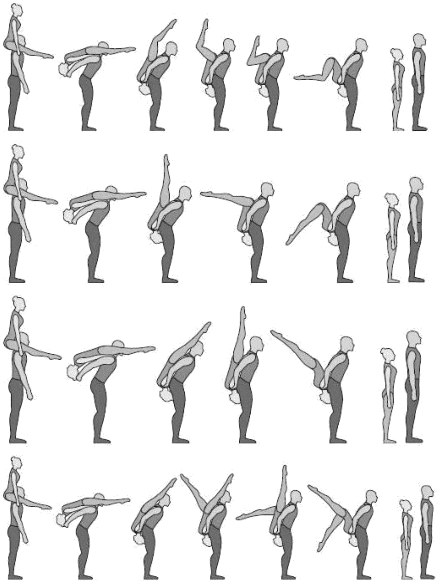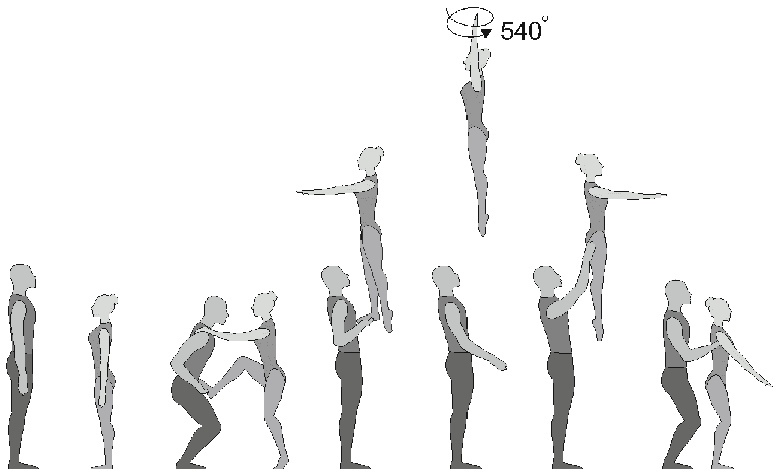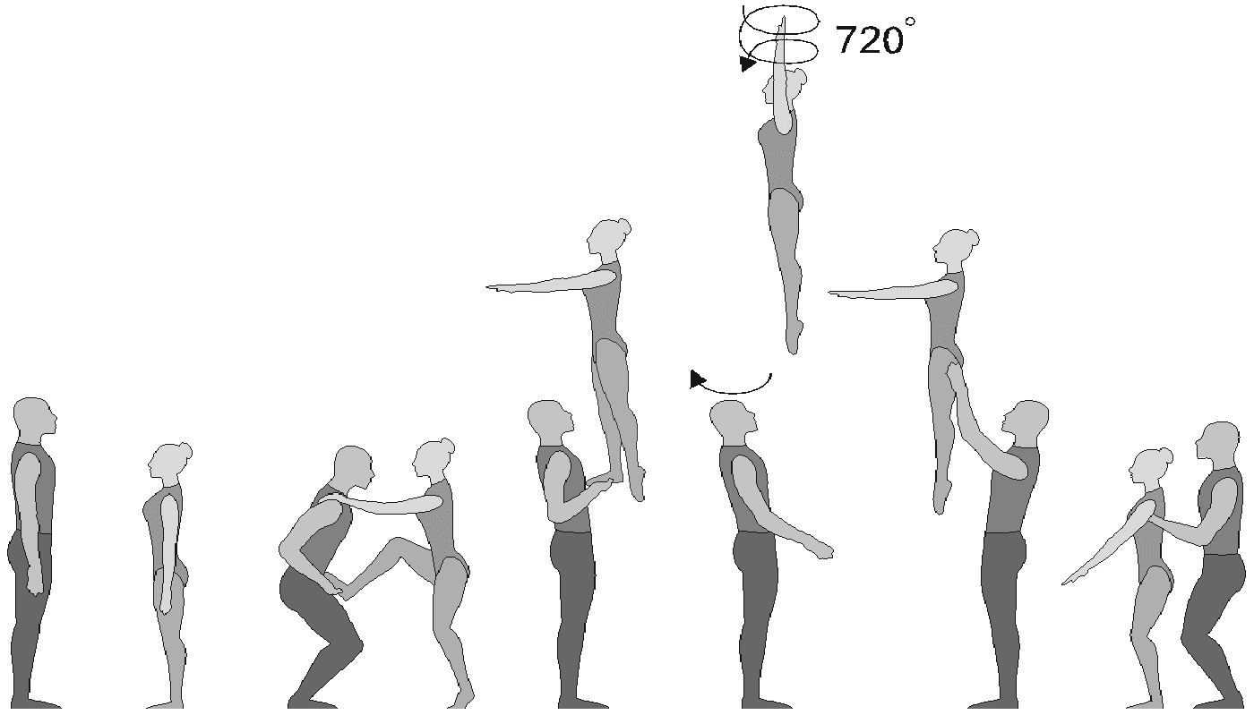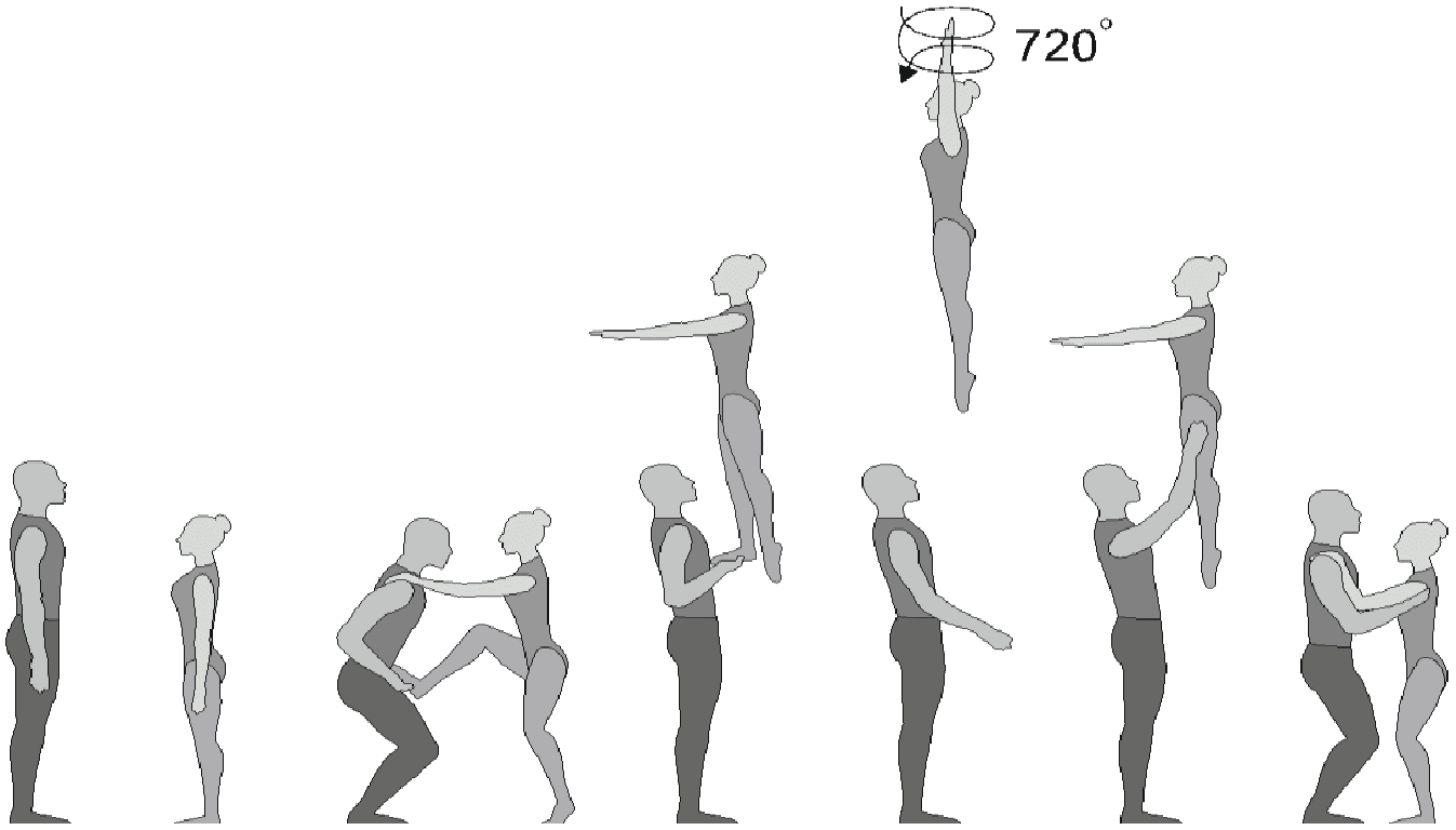 Старт с двух партнеров, поворот на 180°, 5/4 сальто вперед прогнувшись с поворотом на 360°, приземление в руки партнеров лежа на животе