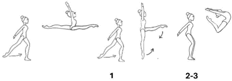 прыжок в "Шпагат": при прыжке с амплитудой 180° передняя нога должна находиться под углом 90°;