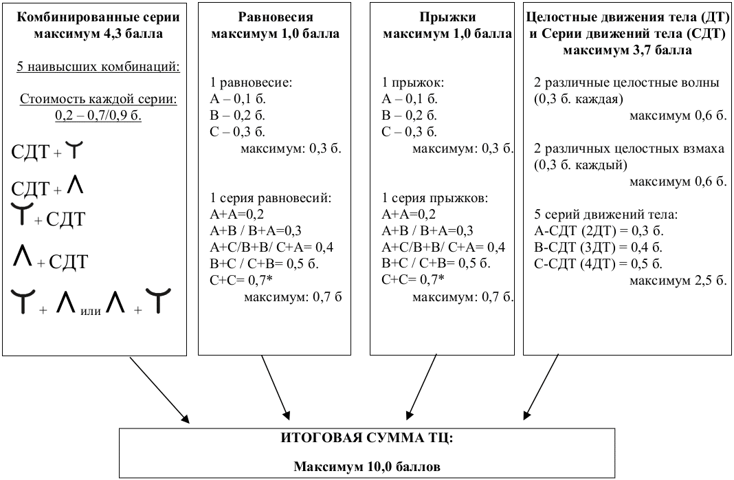 Следующие критерии амплитуды движения тела применяются для повышения технической стоимости равновесий и прыжков со значения A до B или C: