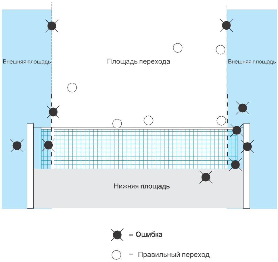 КАСАНИЕ СЕТКИ ИГРОКОМ - ПОДАННЫЙ МЯЧ НЕ ПЕРЕШЕЛ К СОПЕРНИКУ ЧЕРЕЗ ПЛОЩАДЬ ПЕРЕХОДА