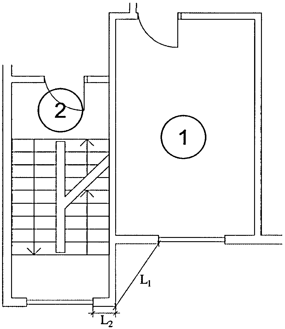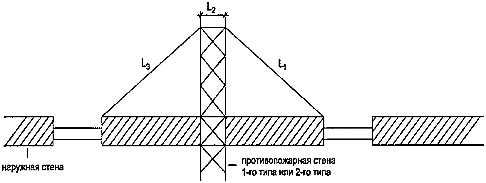 L1, L2 - размер внешнего участка противопожарной стены 1-го типа.