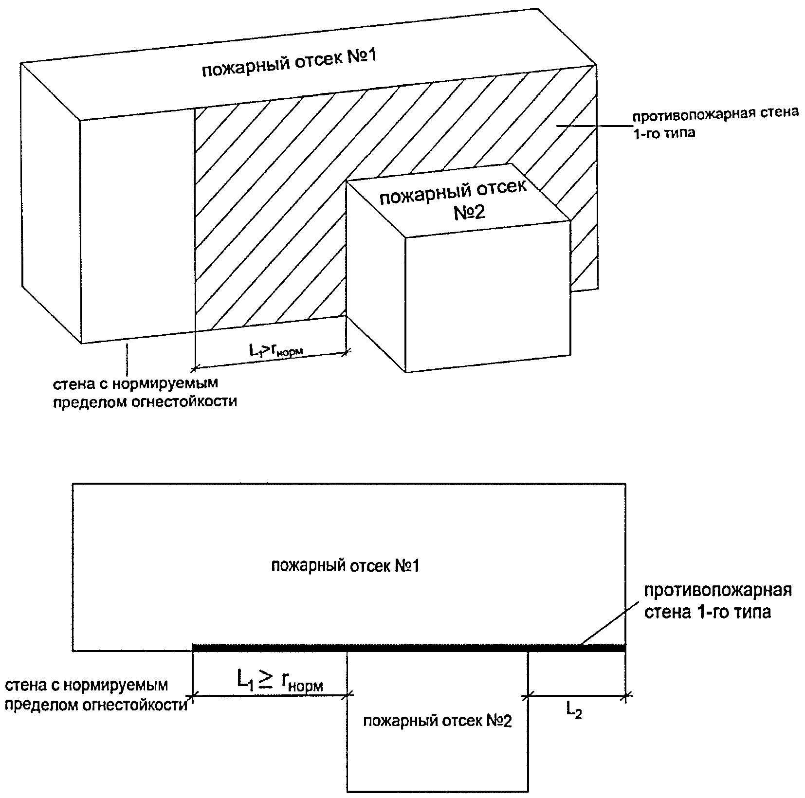 При этом границы внешних участков противопожарной стены должны находиться на расстоянии не менее нормируемого противопожарного расстояния от более низкого пожарного отсека (рисунки А2, А3 приложения А к настоящему своду правил). Нормируемое противопожарное расстояние определяется в соответствии с СП 4.13130 на основе данных о степени огнестойкости, классе конструктивной пожарной опасности и других характеристик пожарных отсеков, разделенных противопожарной стеной 1-го типа.";