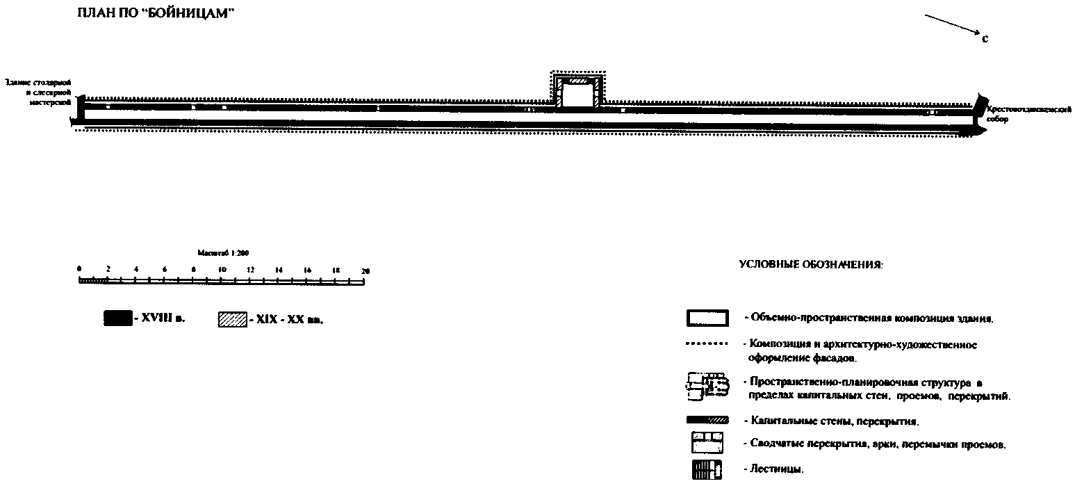 объемно-пространственная композиция, отрезка крепостной стены с коридором, перекрытого двускатной кровлей, в том числе высотные отметки по карнизам (с учетом восстановительных работ середины 1970-х годов, рук. Т.В. Гладенко);