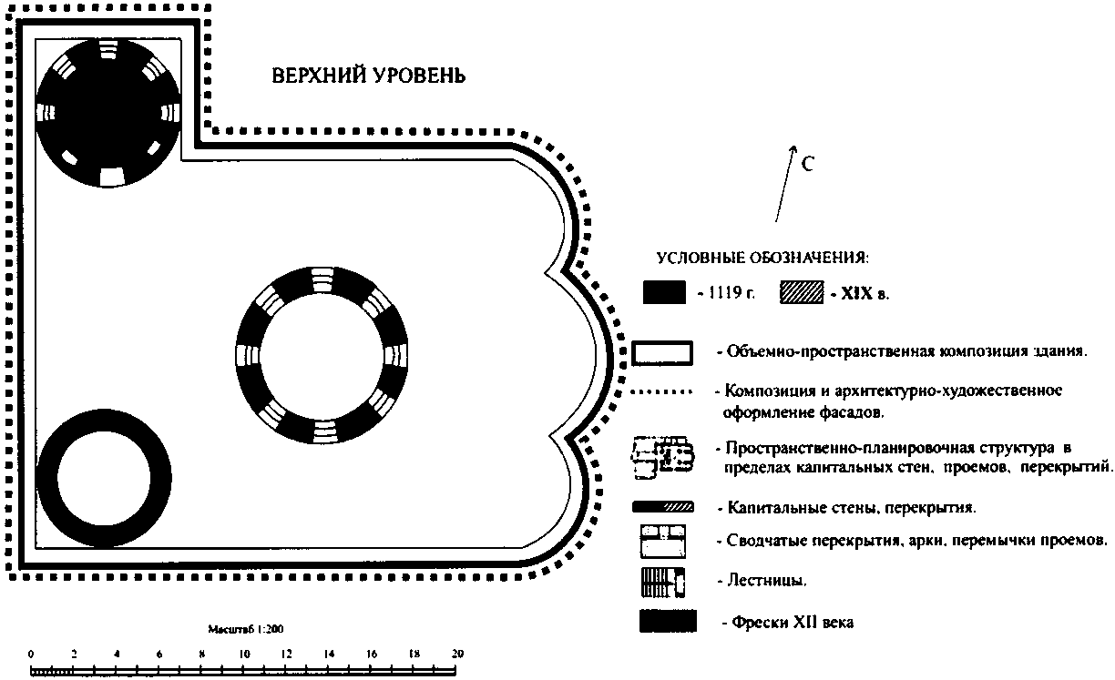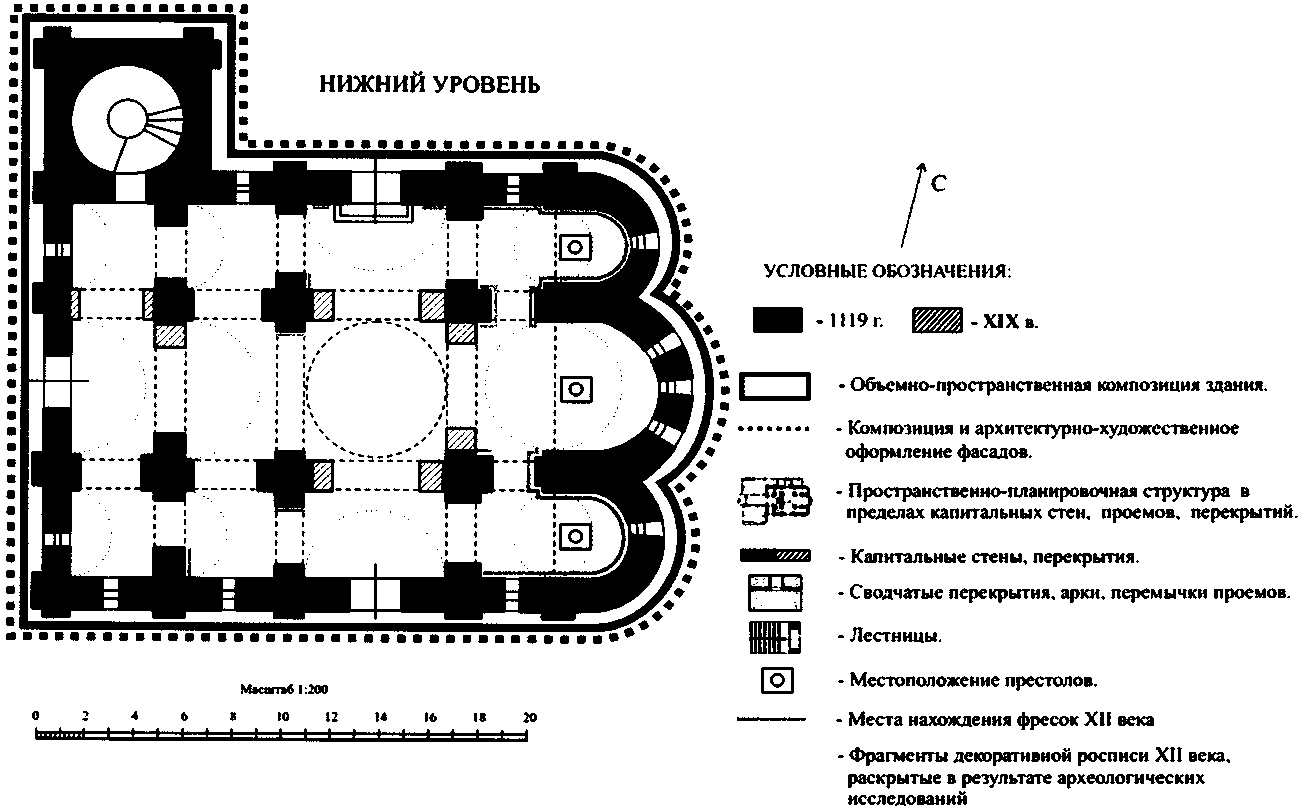 объемно-пространственная композиция здания XII века: квадратное в плане, с примыкающей с запада квадратной в плане башней с лестницей, трехнефное, крестовокупольное, шестистолпное, трехапсидное, трехглавое, в том числе высотные отметки по венчающим карнизам (с учетом реставрации 1930-х годов, рук. М.К. Каргер и восстановительных работ начала 1950-х годов, рук. Д.М. Федоров и Л.М. Шуляк);