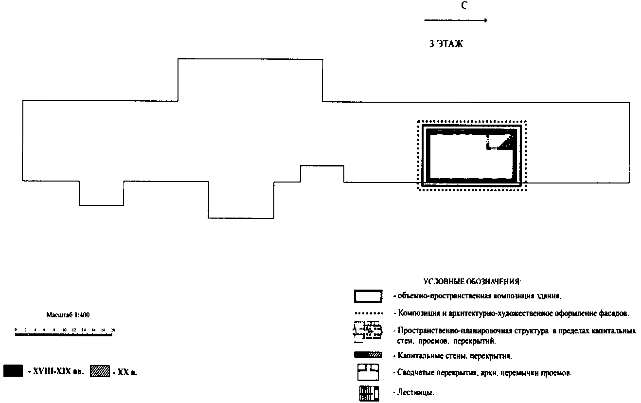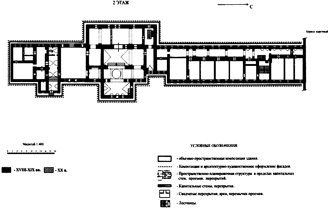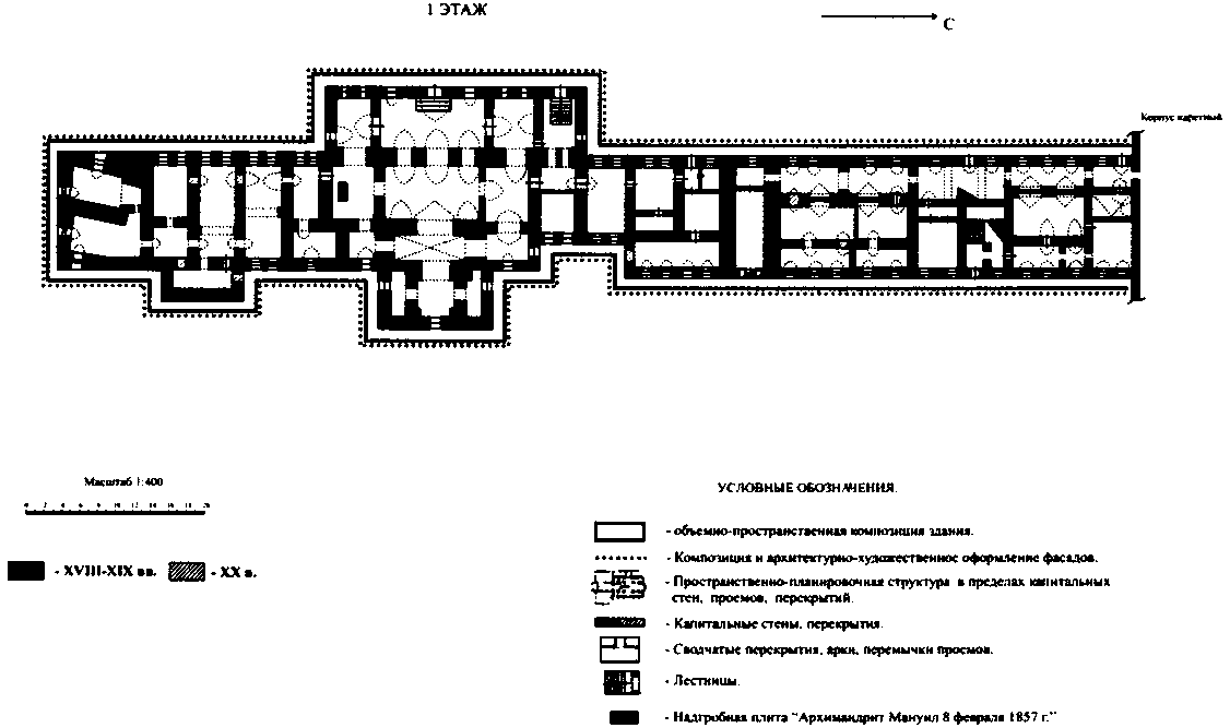 пространственно-планировочная структура здания в пределах капитальных стен, первоначальных дверных и арочных проемов, перегородок и сводчатых перекрытий середины XVIII века, 1820-х годов;