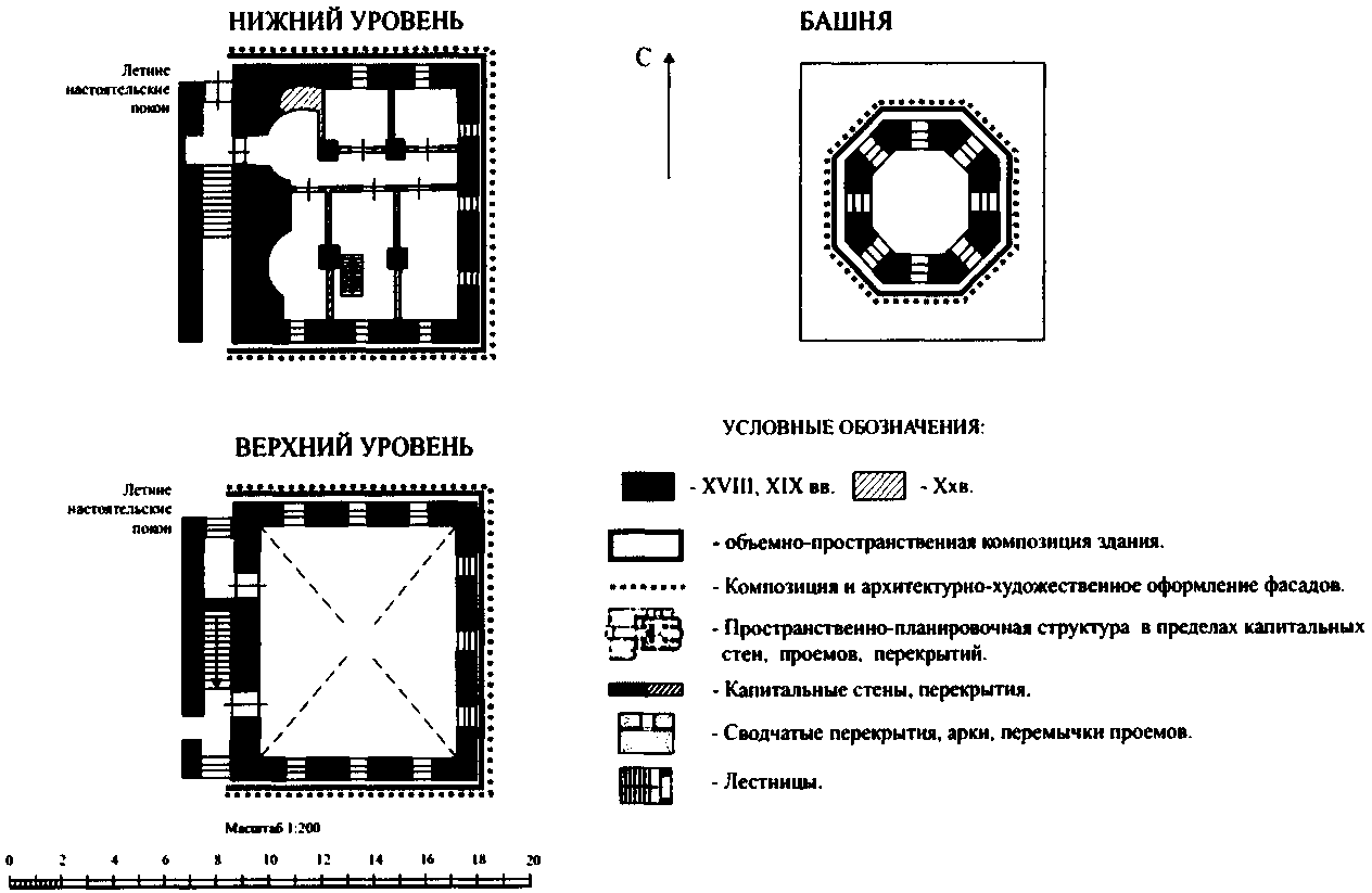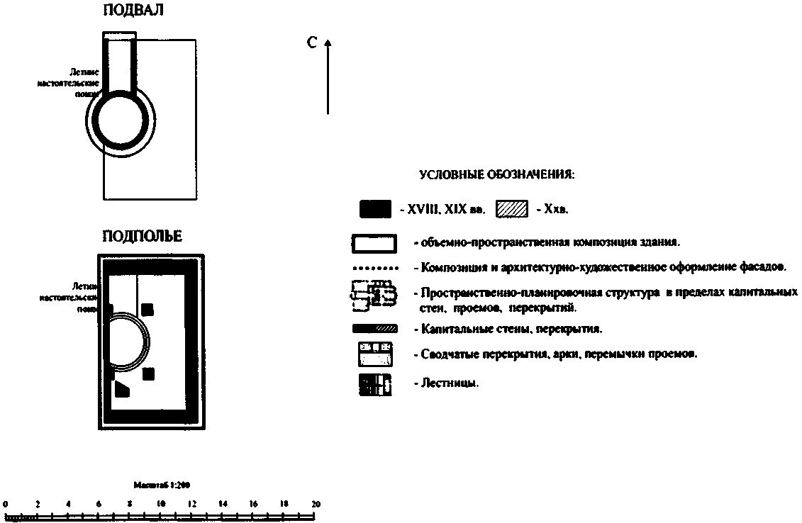 пространственно-планировочная структура здания в пределах капитальных стен, дверных и арочных проемов, сводчатых и плоских перекрытий XVIII века (1835 года);