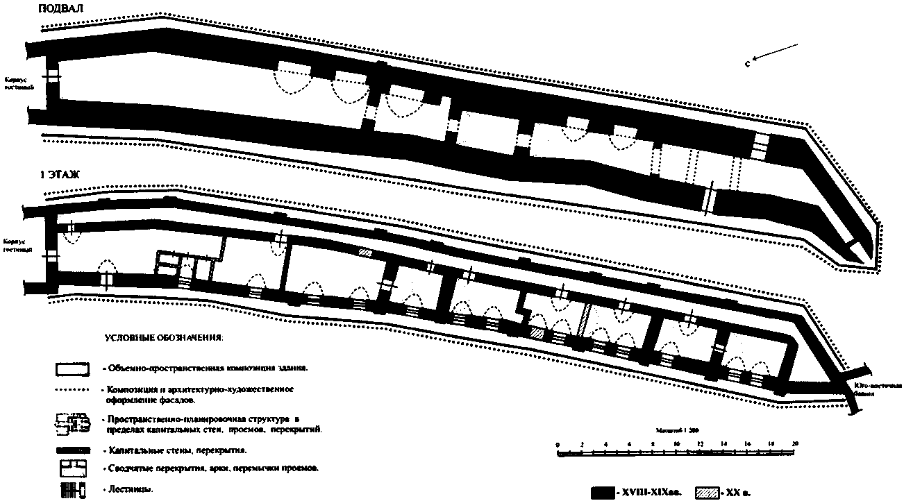 пространственно-планировочная структура здания в пределах капитальных стен, дверных проемов и сводчатых перекрытий, местоположение межэтажной лестницы;