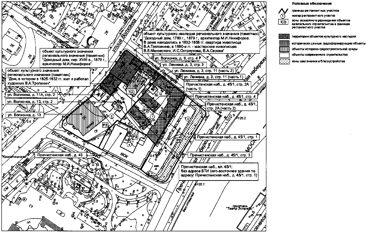 2. Объекты капитального строительства в границах регламентного участка: Пречистенская наб., д. 45/1, стр. 1, стр. 2А, стр. 3, стр. 4, ул. Ленивка, д. 3, стр. 11 (часть)