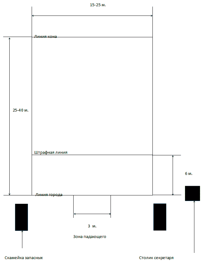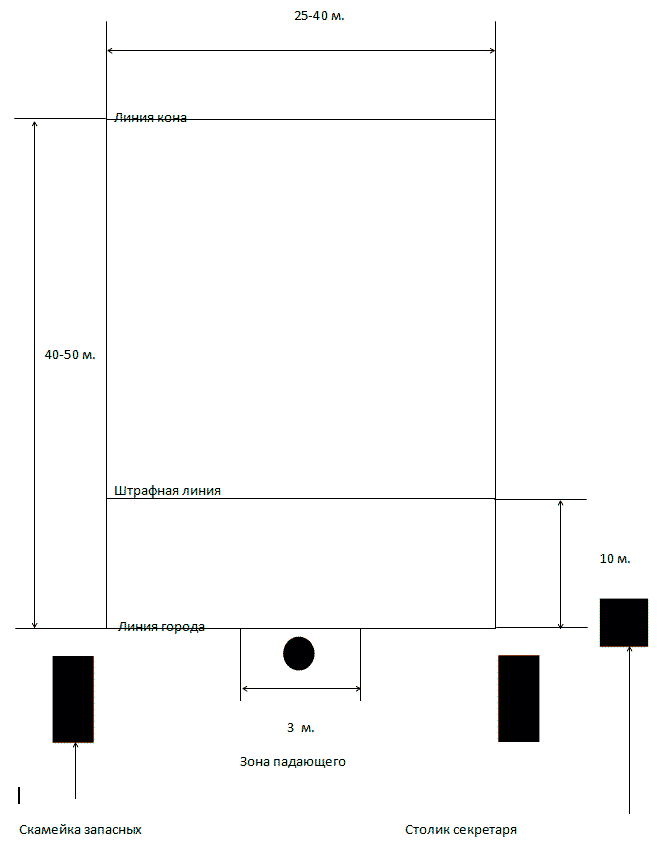 а) Игровая площадка размечается хорошо видимыми линиями. Ширина линий разметки 5 см. Линии, расположенные по длинным сторонам игровой площадки, называются боковыми линиями, линии вдоль коротких сторон - линиями дома и линиями кона. Поле должно быть окружено свободной зоной: за линией дома - не менее 5 м, за боковыми линиями - 5 - 10 м, за линией кона - не менее 10 м. В 10 метрах от линии дома проводится контрольная линия, которая образует "штрафную зону".