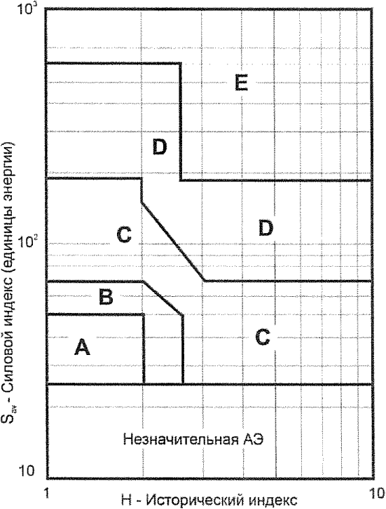 10.2. Если испытание проводят с учетом требований стандарта EN 14584, включая расположение ПАЭ, калибровку каналов акустико-эмиссионной аппаратуры, программу нагружения, определение параметров регистрации данных, то, как в реальном времени, так и при пост-обработке, оценка источников акустической эмиссии может выполнена по следующим характеристикам акустико-эмиссионной активности: