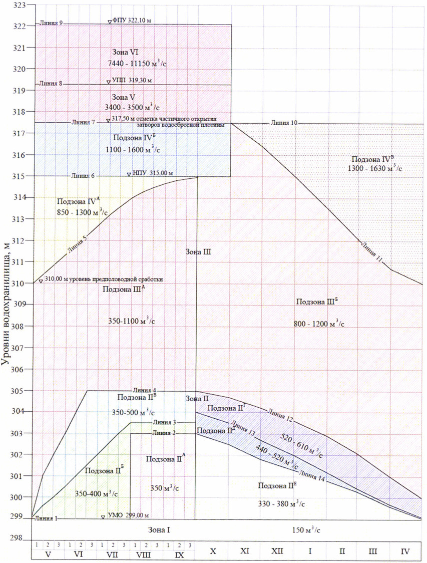"8.2.2. Поле диспетчерского графика, построенного в координатах отметок уровней воды у плотины Зейского гидроузла и времени, разбито на шесть режимных зон.