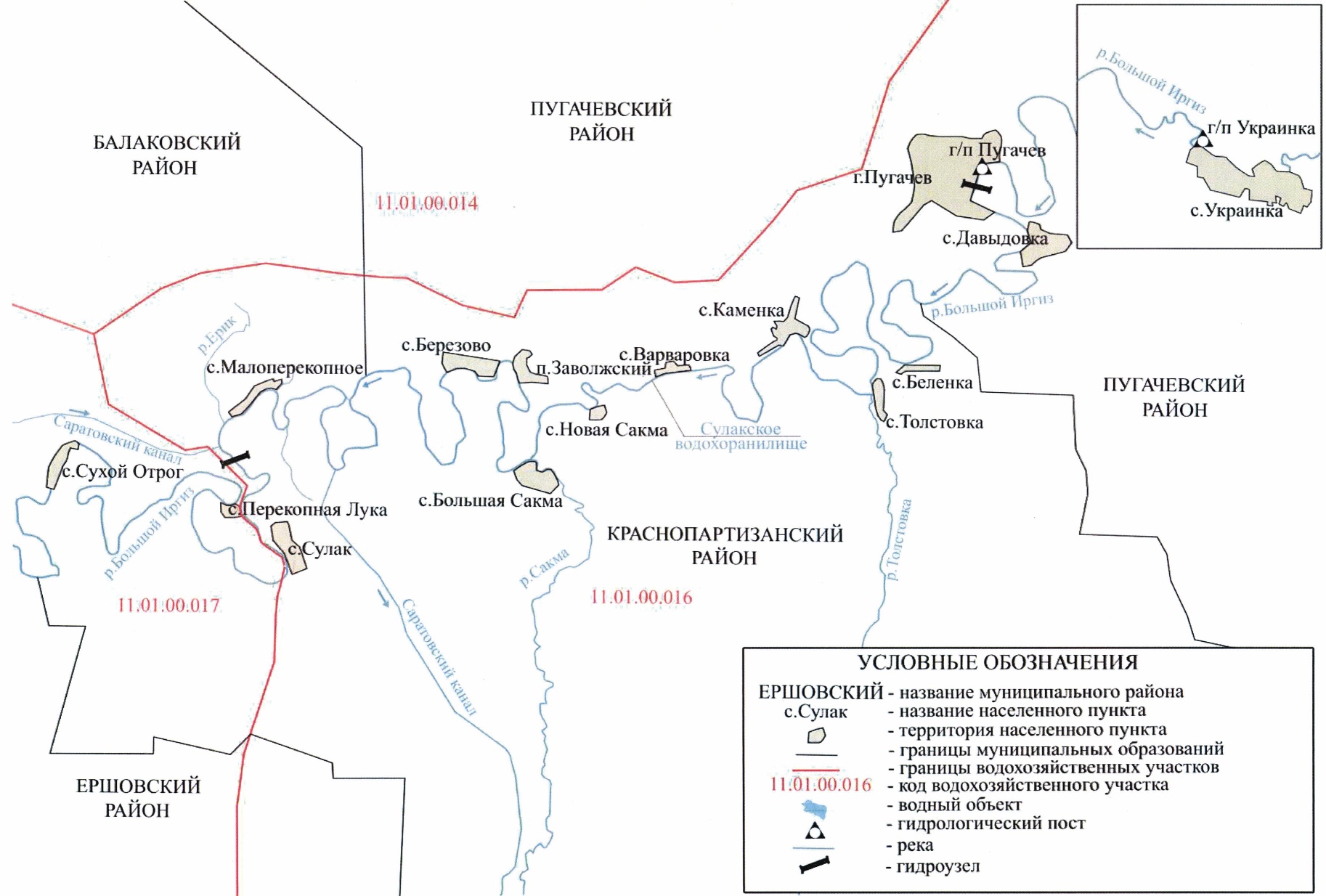 4. Гидроузел Сулакского водохранилища расположен в Саратовской области на р. Большой Иргиз, являющейся левым притоком р. Волги, в 6 км севернее села Сулак Краснопартизанского муниципального района. Водохранилище располагается на территориях Балаковского, Краснопартизанского и Пугачевского муниципальных районов Саратовской области.